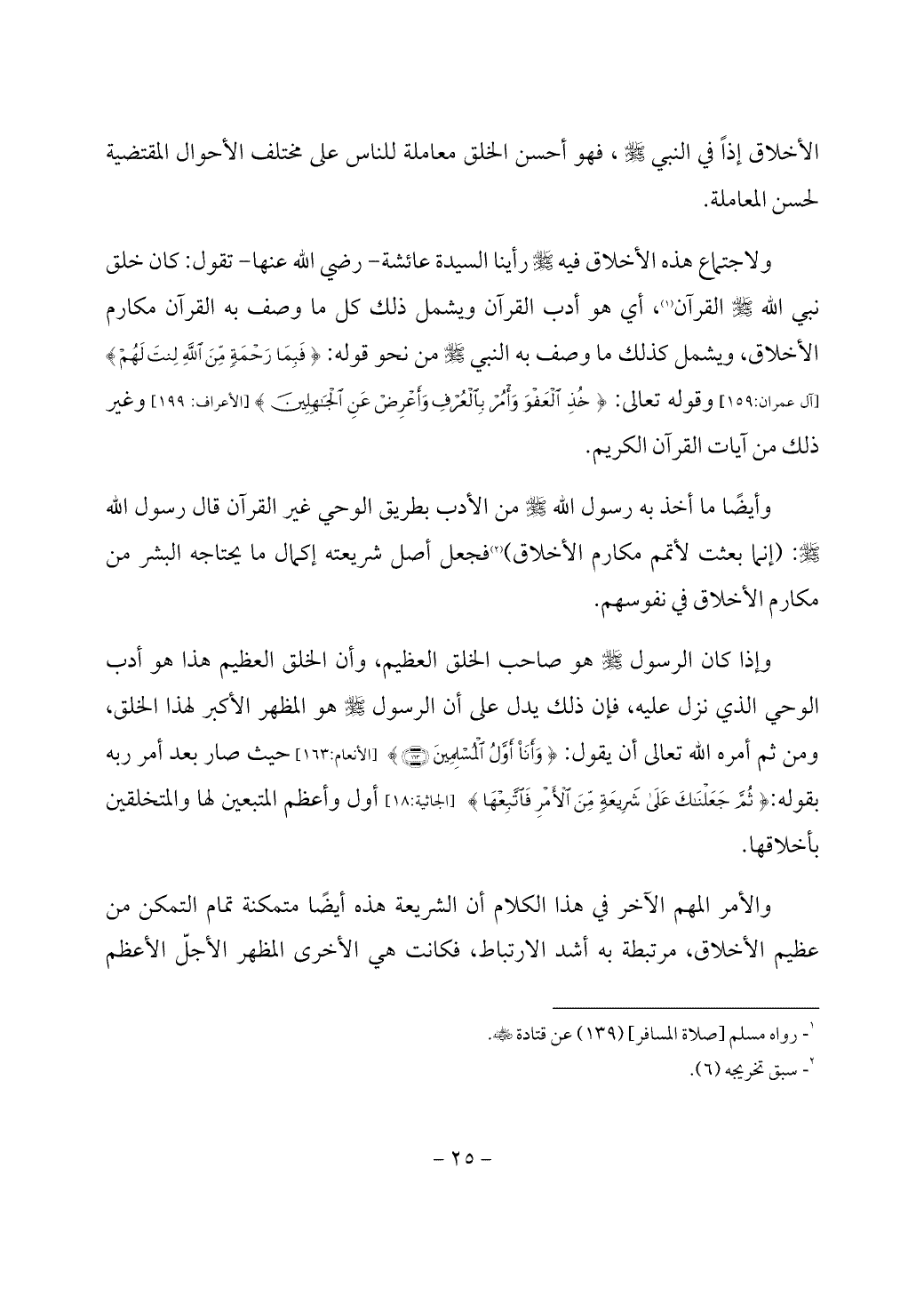 ولاجتماع هذه الأخلاق فيه - صَلَّى اللَّهُ عَلَيْهِ وَسَلَّمَ - رأينا السيدة عائشة - رضي الله عنها - تقول: كان خلق نبي الله - صَلَّى اللَّهُ عَلَيْهِ وَسَلَّمَ - القرآن (¬1)، أي هو أدب القرآن ويشمل ذلك كل ما وصف به القرآن مكارم الأخلاق، ويشمل كذلك ما وصف به النبي - صَلَّى اللَّهُ عَلَيْهِ وَسَلَّمَ - من نحو قوله: {فَبِمَا رَحْمَةٍ مِنَ اللَّهِ لِنْتَ لَهُمْ} [آل عمران: 159] وقوله تعالى: {خُذِ الْعَفْوَ وَأْمُرْ بِالْعُرْفِ وَأَعْرِضْ عَنِ الْجَاهِلِينَ} [الأعراف: 199] وغير ذلك من آيات القرآن الكريم.