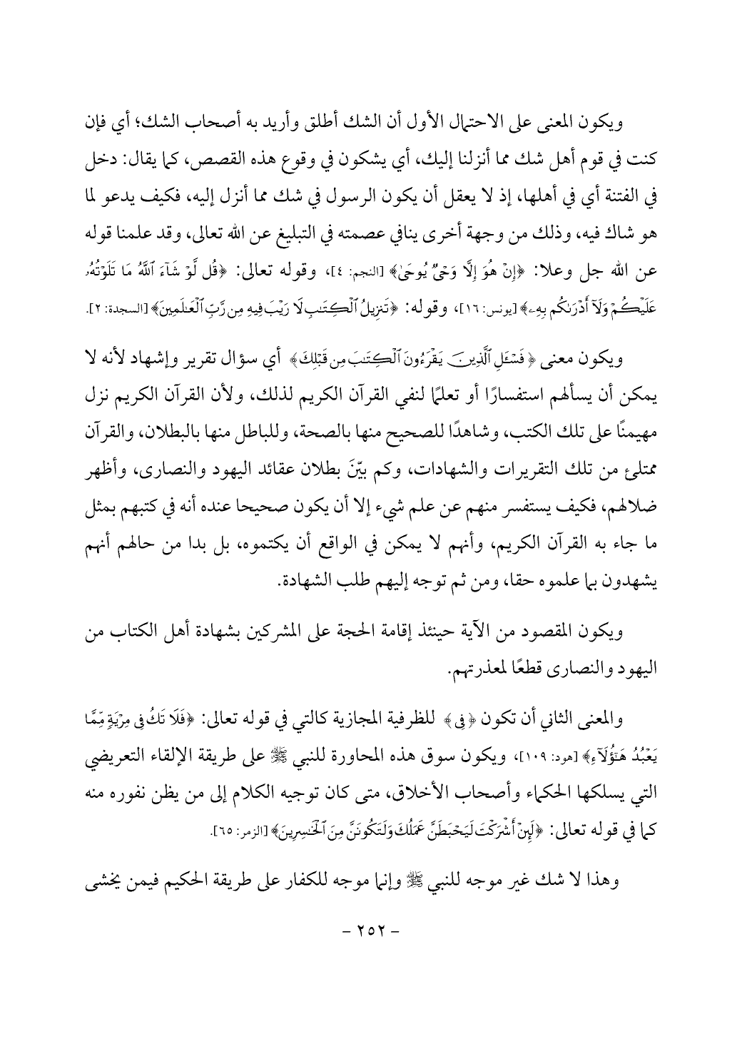 ويكون المعنى على الاحتمال الأول أن الشك أطلق وأريد به أصحاب الشك؛ أي فإن كنت في قوم أهل شك مما أنزلنا إليك، أي يشكون في وقوع هذه القصص، كما يقال: دخل في الفتنة أي في أهلها، إذ لا يعقل أن يكون الرسول في شك مما أنزل إليه، فكيف يدعو لما هو شاك فيه، وذلك من وجهة أخرى ينافي عصمته في التبليغ عن الله تعالى، وقد علمنا قوله عن الله جل وعلا: {إِنْ هُوَ إِلَّا وَحْيٌ يُوحَى} [النجم: 4]، وقوله تعالى: {قُلْ لَوْ شَاءَ اللَّهُ مَا تَلَوْتُهُ عَلَيْكُمْ وَلَا أَدْرَاكُمْ بِهِ} [يونس: 16]، وقوله: {تَنْزِيلُ الْكِتَابِ لَا رَيْبَ فِيهِ مِنْ رَبِّ الْعَالَمِينَ} [السجدة: 2].