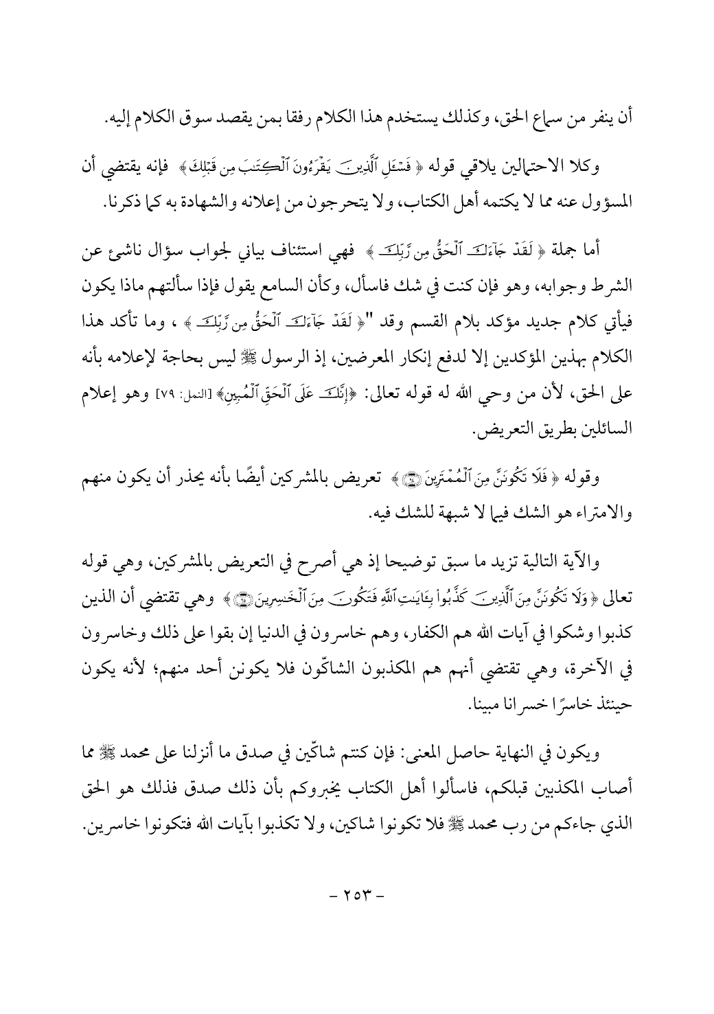 والآية التالية تزيد ما سبق توضيحا إذ هي أصرح في التعريض بالمشركين، وهي قوله تعالى {وَلَا تَكُونَنَّ مِنَ الَّذِينَ كَذَّبُوا بِآَيَاتِ اللَّهِ فَتَكُونَ مِنَ الْخَاسِرِينَ (95)} وهي تقتضي أن الذين كذبوا وشكوا في آيات الله هم الكفار، وهم خاسرون في الدنيا إن بقوا على ذلك وخاسرون في الآخرة، وهي تقتضي أنهم هم المكذبون الشاكّون فلا يكونن أحد منهم؛ لأنه يكون حينئذ خاسرًا خسرانا مبينا.