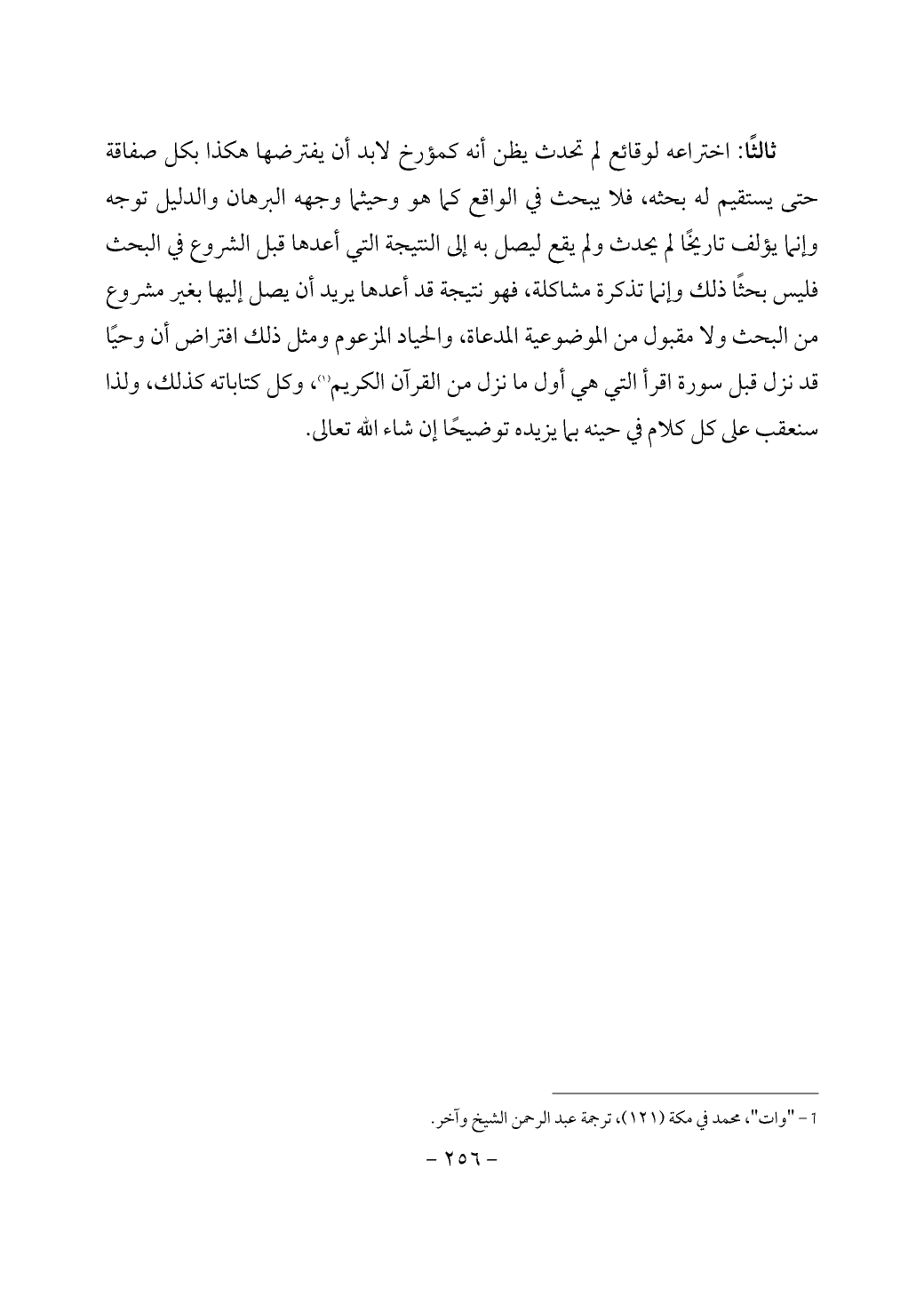 ثالثًا: اختراعه لوقائع لم تحدث يظن أنه كمؤرخ لابد أن يفترضها هكذا بكل صفاقة حتى يستقيم له بحثه، فلا يبحث في الواقع كما هو وحيثما وجهه البرهان والدليل توجه وإنما يؤلف تاريخًا لم يحدث ولم يقع ليصل به إلى النتيجة التي أعدها قبل الشروع في البحث فليس بحثًا ذلك وإنما تذكرة مشاكلة، فهو نتيجة قد أعدها يريد أن يصل إليها بغير مشروع من البحث ولا مقبول من الموضوعية المدعاة، والحياد المزعوم ومثل ذلك افتراض أن وحيًا قد نزل قبل سورة اقرأ التي هي أول ما نزل من القرآن الكريم (¬1)، وكل كتاباته كذلك، ولذا سنعقب على كل كلام في حينه بما يزيده توضيحًا إن شاء الله تعالى.