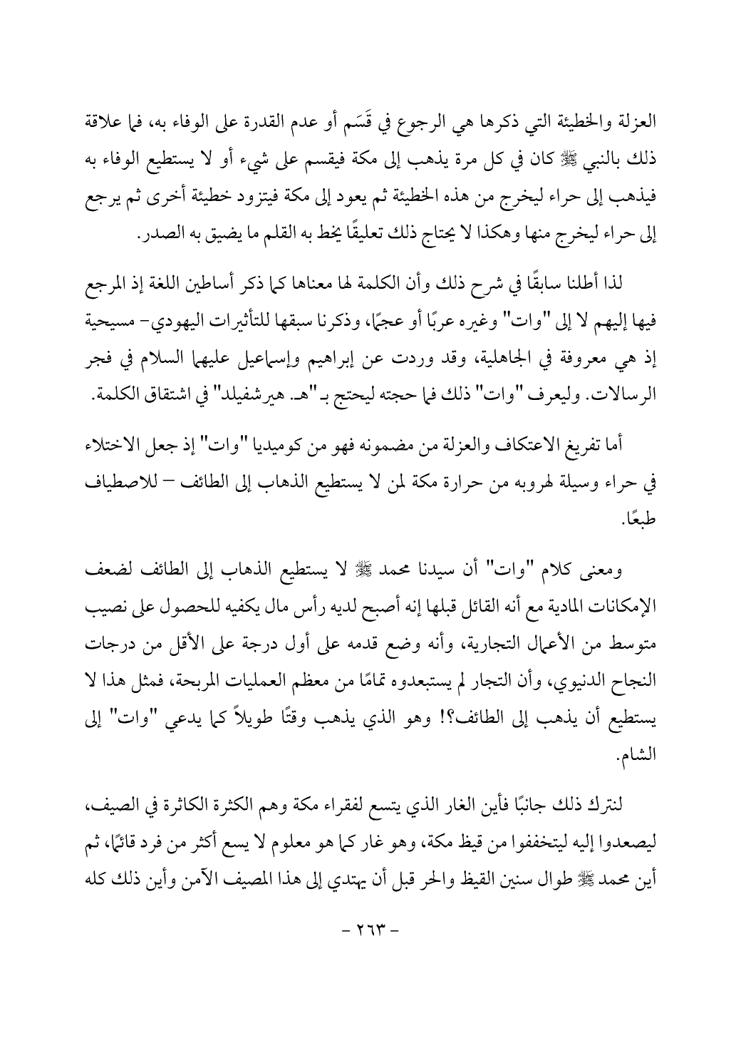 لذا أطلنا سابقًا في شرح ذلك وأن الكلمة لها معناها كما ذكر أساطين اللغة إذ المرجع فيها إليهم لا إلى "وات" وغيره عربًا أو عجمًا، وذكرنا سبقها للتأثيرات اليهودي - مسيحية إذ هي معروفة في الجاهلية، وقد وردت عن إبراهيم وإسماعيل عليهما السلام في فجر الرسالات. وليعرف "وات" ذلك فما حجته ليحتج بـ " هـ. هيرشفيلد" في اشتقاق الكلمة.