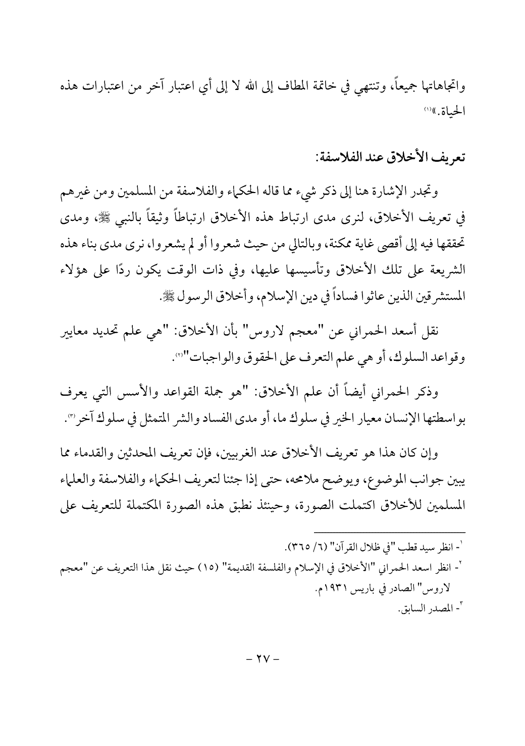 (¬2) انظر اسعد الحمراني "الأخلاق في الإسلام والفلسفة القديمة" (15) حيث نقل هذا التعريف عن "معجم لاروس" الصادر في باريس 1931 م.