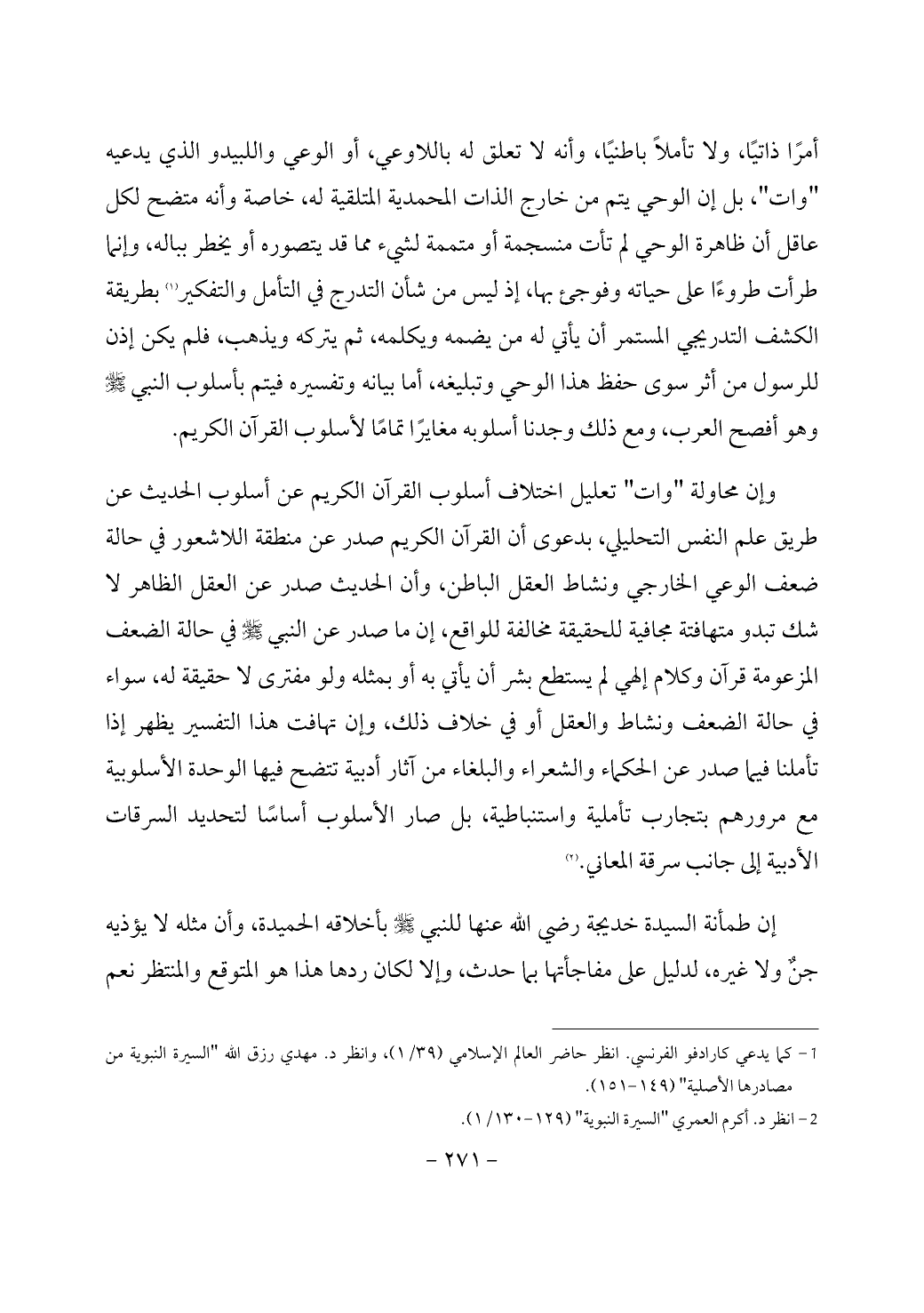 وإن محاولة "وات" تعليل اختلاف أسلوب القرآن الكريم عن أسلوب الحديث عن طريق علم النفس التحليلي، بدعوى أن القرآن الكريم صدر عن منطقة اللاشعور في حالة ضعف الوعي الخارجي ونشاط العقل الباطن، وأن الحديث صدر عن العقل الظاهر لا شك تبدو متهافتة مجافية للحقيقة مخالفة للواقع، إن ما صدر عن النبي - صَلَّى اللَّهُ عَلَيْهِ وَسَلَّمَ - في حالة الضعف المزعومة قرآن وكلام إلهي لم يستطع بشر أن يأتي به أو بمثله ولو مفترى لا حقيقة له، سواء في حالة الضعف ونشاط والعقل أو في خلاف ذلك، وإن تهافت هذا التفسير يظهر إذا تأملنا فيما صدر عن الحكماء والشعراء والبلغاء من آثار أدبية تتضح فيها الوحدة الأسلوبية مع مرورهم بتجارب تأملية واستنباطية، بل صار الأسلوب أساسًا لتحديد السرقات الأدبية إلى جانب سرقة المعاني. (¬2)