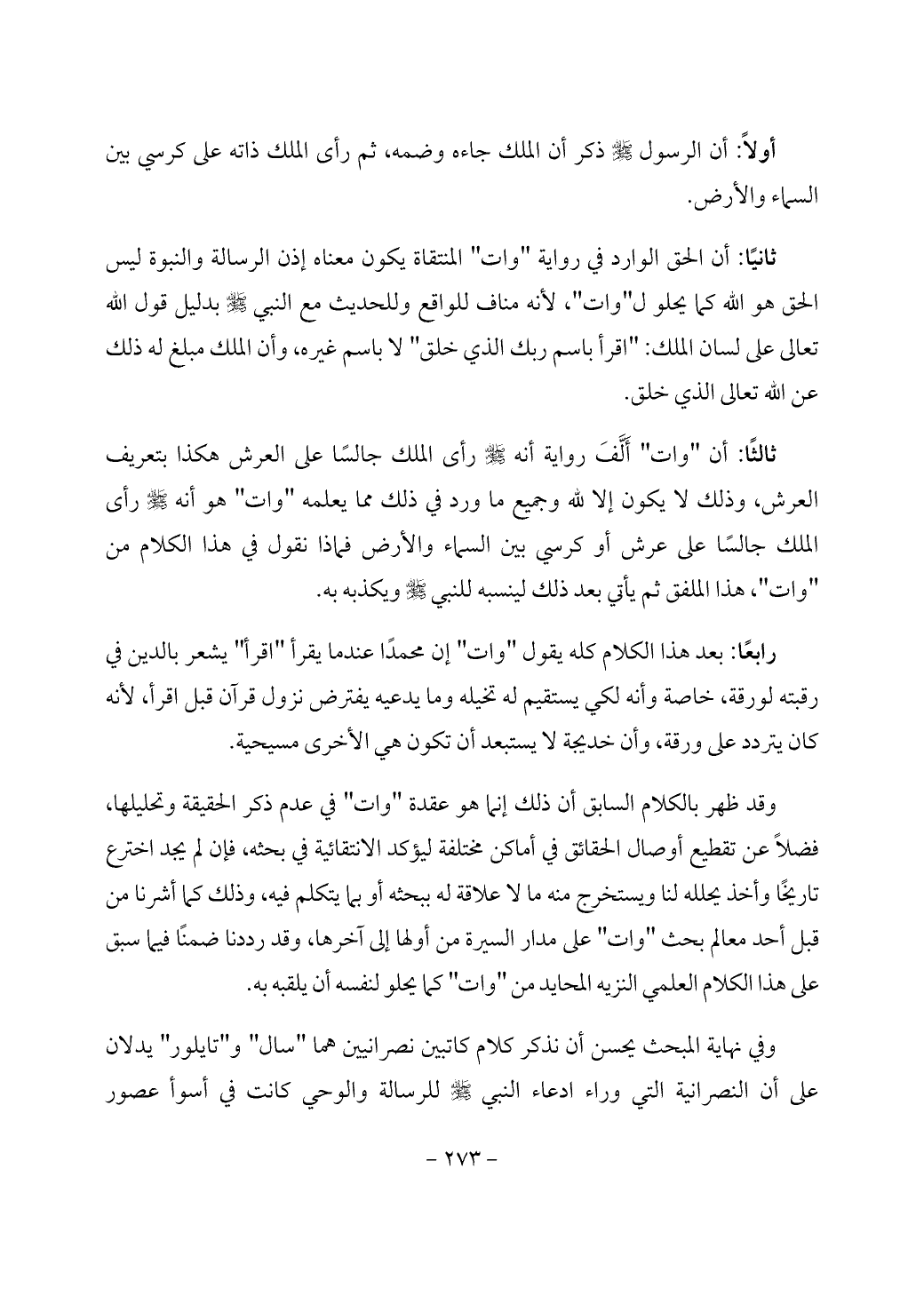 ثالثًا: أن "وات" أَلَّفَ رواية أنه - صَلَّى اللَّهُ عَلَيْهِ وَسَلَّمَ - رأى الملك جالسًا على العرش هكذا بتعريف العرش، وذلك لا يكون إلا لله وجميع ما ورد في ذلك مما يعلمه "وات" هو أنه - صَلَّى اللَّهُ عَلَيْهِ وَسَلَّمَ - رأى الملك جالسًا على عرش أو كرسي بين السماء والأرض فماذا نقول في هذا الكلام من "وات"، هذا الملفق ثم يأتي بعد ذلك لينسبه للنبي - صَلَّى اللَّهُ عَلَيْهِ وَسَلَّمَ - ويكذبه به.