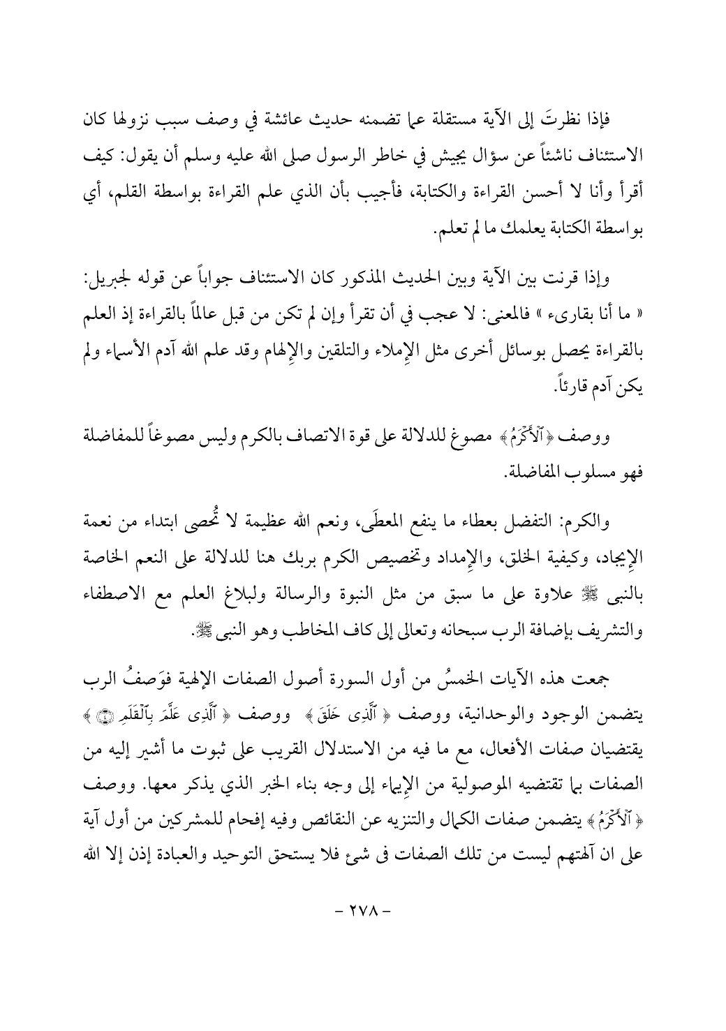 والكرم: التفضل بعطاء ما ينفع المعطَى، ونعم الله عظيمة لا تُحصى ابتداء من نعمة الإِيجاد، وكيفية الخلق، والإِمداد وتخصيص الكرم بربك هنا للدلالة على النعم الخاصة بالنبي - صَلَّى اللَّهُ عَلَيْهِ وَسَلَّمَ - علاوة على ما سبق من مثل النبوة والرسالة ولبلاغ العلم مع الاصطفاء والتشريف بإضافة الرب سبحانه وتعالى إلى كاف المخاطب وهو النبي - صَلَّى اللَّهُ عَلَيْهِ وَسَلَّمَ -.