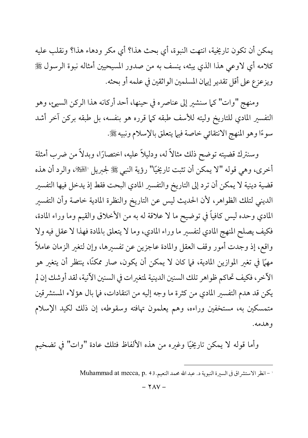وسنترك قضيته توضح ذلك مثالاً له، ودليلاً عليه، اختصارًا، وبدلاً من ضرب أمثلة أخرى، وهي قوله "لا يمكن أن تثبت تاريخيًا" رؤية النبي - صَلَّى اللَّهُ عَلَيْهِ وَسَلَّمَ - لجبريل - عليه السلام - (¬1)، والرد أن هذه قضية دينية لا يمكن أن ترد إلى التاريخ والتفسير المادي البحت فقط إذ يدخل فيها التفسير الديني لتلك الظواهر، لأن الحديث ليس عن التاريخ والنظرة المادية خاصة وأن التفسير المادي وحده ليس كافياً في توضيح ما لا علاقة له به من الأخلاق والقيم وما وراء المادة، فكيف يصلح المنهج المادي لتفسير ما وراء المادي، وما لا يتعلق بالمادة فهذا لا عقل فيه ولا واقع، إذ وجدت أمور وقف العقل والمادة عاجزين عن تفسيرها، وإن لتغير الزمان عاملاً مهمًا في تغير الموازين المادية، فما كان لا يمكن أن يكون، صار ممكنًا، ينتظر أن يتغير هو الآخر، فكيف تحاكم ظواهر تلك السنين الدينية لمتغيرات في السنين الآنية، لقد أوشك إن لم يكن قد هدم التفسير المادي من كثرة ما وجه إليه من انتقادات، فما بال هؤلاء المستشرقين متمسكين به، مستخفين وراءه، وهم يعلمون تهافته وسقوطه، إن ذلك لكيد الإسلام وهدمه.