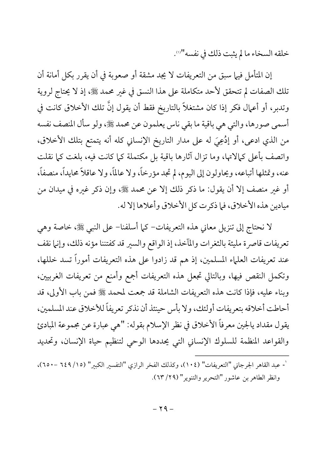 لا نحتاج إلى تنزيل معاني هذه التعريفات - كما أسلفنا - على النبي - صَلَّى اللَّهُ عَلَيْهِ وَسَلَّمَ -، خاصة وهي تعريفات قاصرة مليئة بالثغرات والمآخذ، إذ الواقع والسير قد كفتننا مؤنه ذلك، وإنما نقف عند تعريفات العلماء المسلمين، إذ هم قد زادوا على هذه التعريفات أموراً تسد خللها، وتكمل النقص فيها، وبالتالي تجعل هذه التعريفات أجمع وأمنع من تعريفات الغربيين، وبناء عليه، فإذا كانت هذه التعريفات الشاملة قد جمعت لمحمد - صَلَّى اللَّهُ عَلَيْهِ وَسَلَّمَ - فمن باب الأولى، قد أحاطت أخلاقه بتعريفات أولئك، ولا بأس حينئذ أن نذكر تعريفاً للأخلاق عند المسلمين، يقول مقداد يالجين معرفاً الأخلاق في نظر الإسلام بقوله: "هي عبارة عن مجموعة المبادئ والقواعد المنظمة للسلوك الإنساني التي يحددها الوحي لتنظيم حياة الإنسان، وتحديد