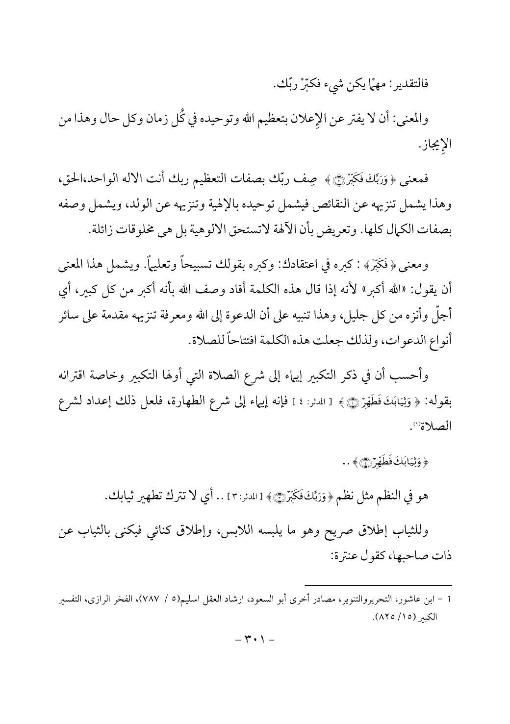 فمعنى {وَرَبَّكَ فَكَبِّرْ (3)} صِف ربّك بصفات التعظيم ربك أنت الاله الواحد، الحق، وهذا يشمل تنزيهه عن النقائص فيشمل توحيده بالإلهية وتنزيهه عن الولد، ويشمل وصفه بصفات الكمال كلها. وتعريض بأن الآلهة لاتستحق الالوهية بل هي مخلوقات زائلة.
