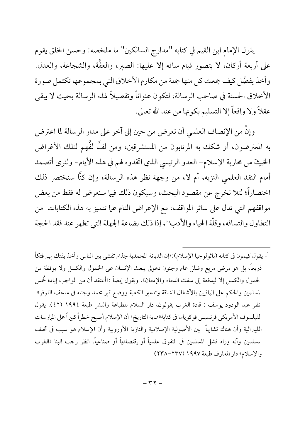 وإنَّ من الإنصاف العلمي أن نعرض من حين إلى آخر على مدار الرسالة لما اعترض به المعترضون، أو شكك به المرتابون من المستشرقين، ومن لفَّ لفَّهم لتلك الأغراض الخبيثة من محاربة الإسلام - العدو الرئيسي الذي اتخذوه لهم في هذه الأيام - ولنرى أتصمد أمام النقد العلمي النزيه، أم لا، من وجهة نظر هذه الرسالة، وإن كنَّا سنختصر ذلك اختصاراً؛ لئلا نخرج عن مقصود البحث، وسيكون ذلك فيما سنعرض له فقط من بعض مواقفهم التي تدل على سائر المواقف، مع الإعراض التام عما تتميز به هذه الكتابات من التطاول والتسافه، وقلّة الحياء والأدب (¬1)، إذا ذلك بضاعة الجهلة التي تظهر عند فقد الحجة