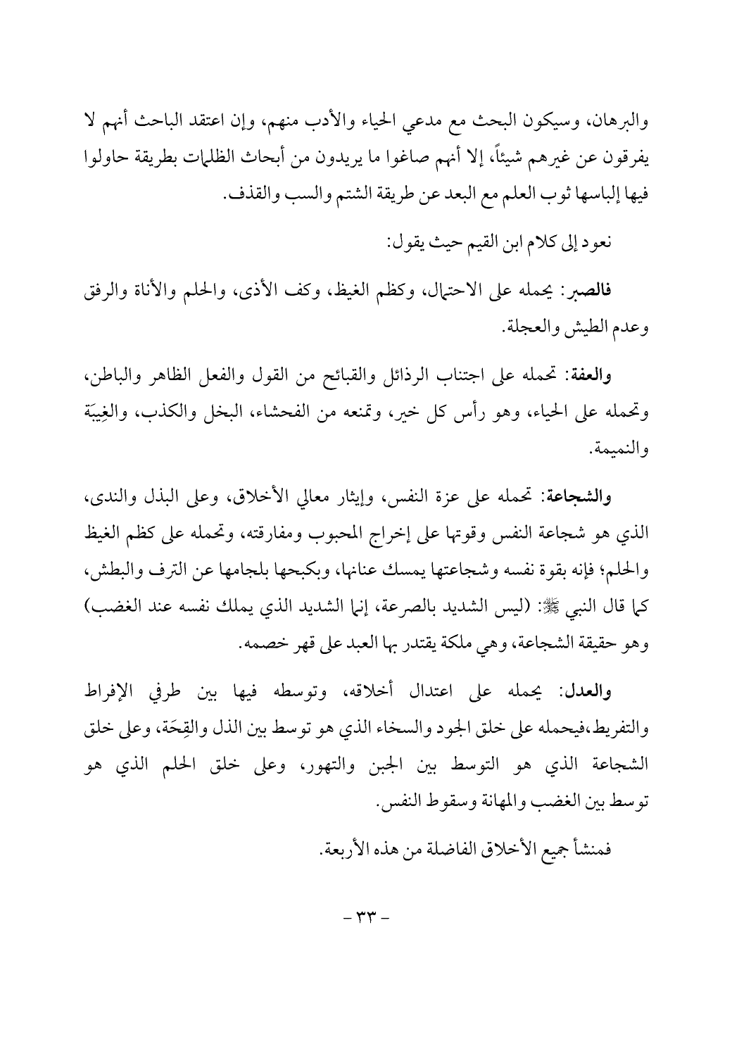 والشجاعة: تحمله على عزة النفس، وإيثار معالي الأخلاق، وعلى البذل والندى، الذي هو شجاعة النفس وقوتها على إخراج المحبوب ومفارقته، وتحمله على كظم الغيظ والحلم؛ فإنه بقوة نفسه وشجاعتها يمسك عنانها، وبكبحها بلجامها عن الترف والبطش، كما قال النبي - صَلَّى اللَّهُ عَلَيْهِ وَسَلَّمَ -: (ليس الشديد بالصرعة، إنما الشديد الذي يملك نفسه عند الغضب) وهو حقيقة الشجاعة، وهي ملكة يقتدر بها العبد على قهر خصمه.