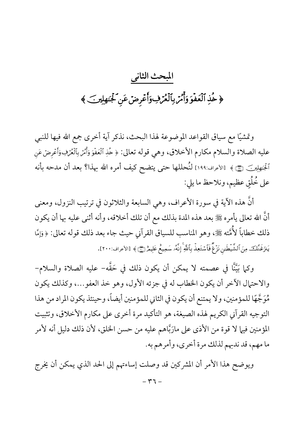 وتمشيًا مع سياق القواعد الموضوعة لهذا البحث، نذكر آية أخرى جمع الله فيها للنبي عليه الصلاة والسلام مكارم الأخلاق، وهي قوله تعالى: {خُذِ الْعَفْوَ وَأْمُرْ بِالْعُرْفِ وَأَعْرِضْ عَنِ الْجَاهِلِينَ (199)} [الأعراف: 199] لنُحللها حتى يتضح كيف أمره الله بهذا؟ بعد أن مدحه بأنه على خُلُقٍ عظيم، ونلاحظ ما يلي: