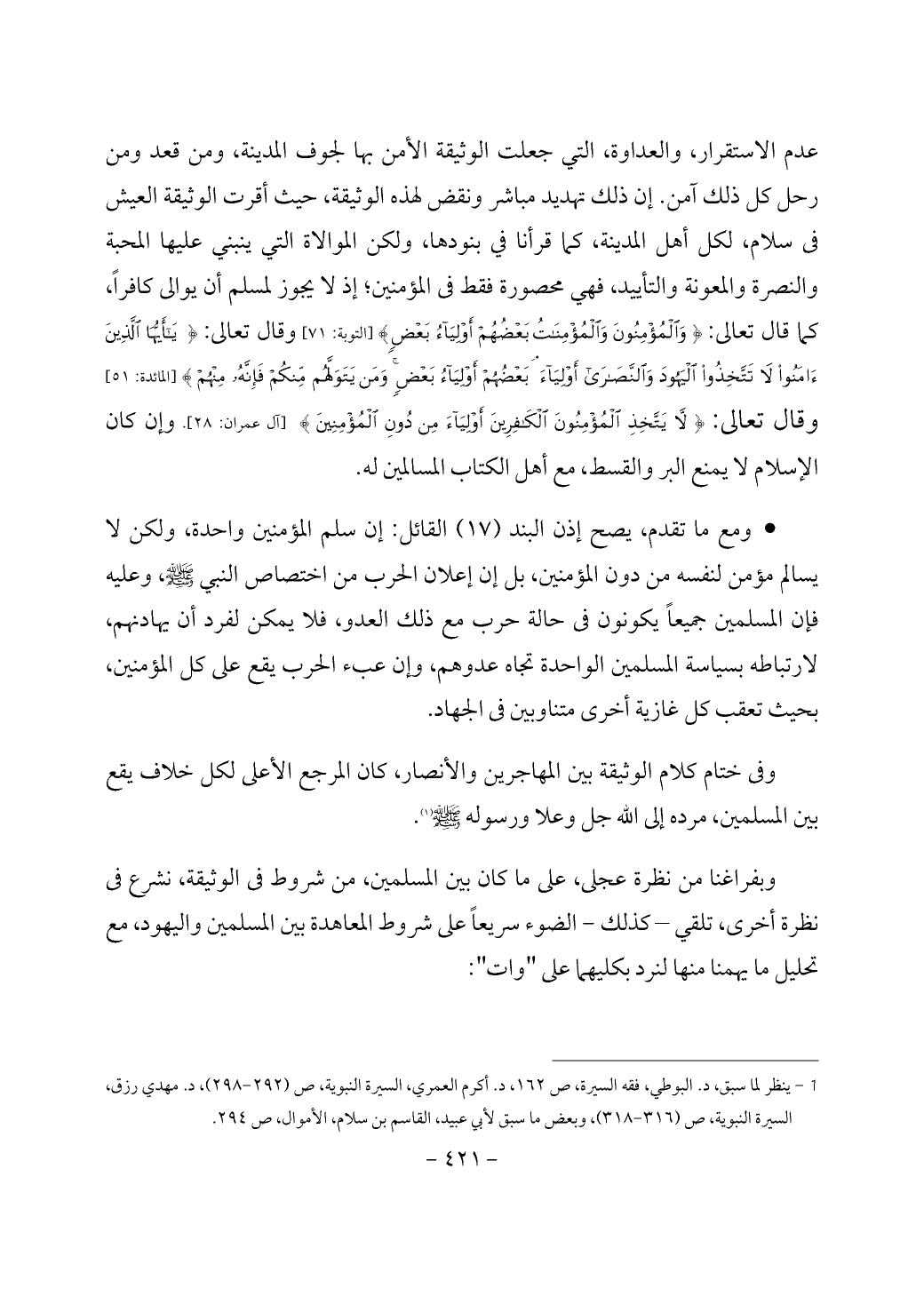 عدم الاستقرار، والعداوة، التي جعلت الوثيقة الأمن بها لجوف المدينة، ومن قعد ومن رحل كل ذلك آمن. إن ذلك تهديد مباشر ونقض لهذه الوثيقة، حيث أقرت الوثيقة العيش في سلام، لكل أهل المدينة، كما قرأنا في بنودها، ولكن الموالاة التي ينبني عليها المحبة والنصرة والمعونة والتأييد، فهي محصورة فقط في المؤمنين؛ إذ لا يجوز لمسلم أن يوالى كافراً، كما قال تعالى: {وَالْمُؤْمِنُونَ وَالْمُؤْمِنَاتُ بَعْضُهُمْ أَوْلِيَاءُ بَعْضٍ} [التوبة: 71] وقال تعالى: {يَا أَيُّهَا الَّذِينَ آَمَنُوا لَا تَتَّخِذُوا الْيَهُودَ وَالنَّصَارَى أَوْلِيَاءَ بَعْضُهُمْ أَوْلِيَاءُ بَعْضٍ وَمَنْ يَتَوَلَّهُمْ مِنْكُمْ فَإِنَّهُ مِنْهُمْ} [المائدة: 51] وقال تعالى: {لَا يَتَّخِذِ الْمُؤْمِنُونَ الْكَافِرِينَ أَوْلِيَاءَ مِنْ دُونِ الْمُؤْمِنِينَ} [آل عمران: 28]. وإن كان الإسلام لا يمنع البر والقسط، مع أهل الكتاب المسالمين له.