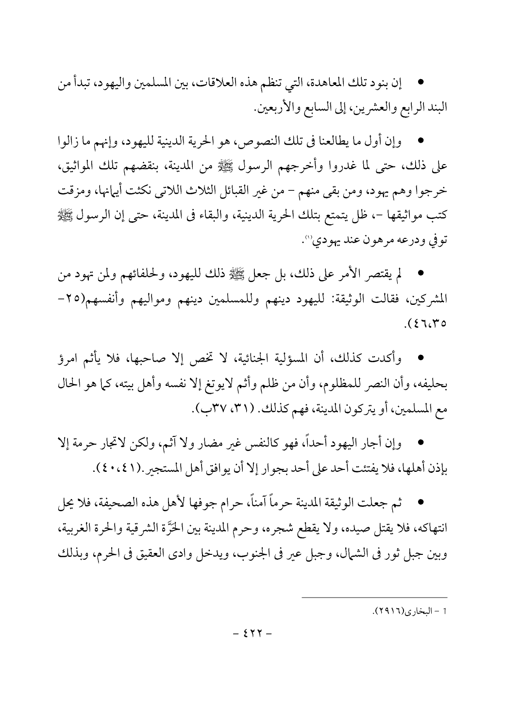 - إن بنود تلك المعاهدة، التي تنظم هذه العلاقات، بين المسلمين واليهود، تبدأ من البند الرابع والعشرين، إلى السابع والأربعين.