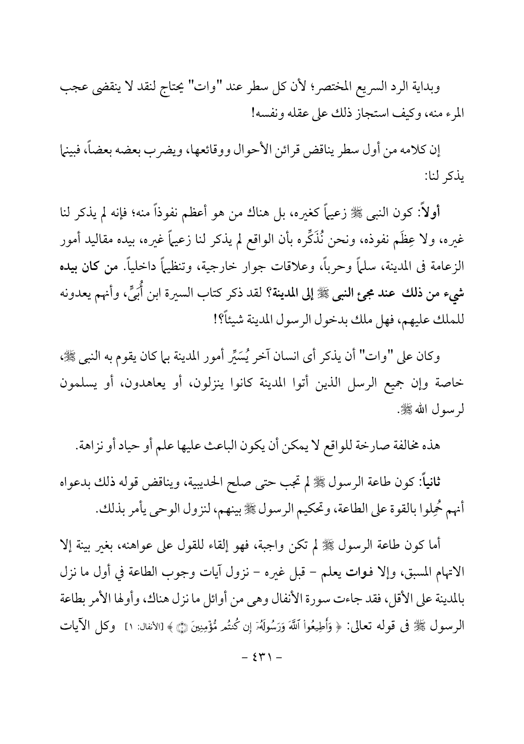 أما كون طاعة الرسول - صَلَّى اللَّهُ عَلَيْهِ وَسَلَّمَ - لم تكن واجبة، فهو إلقاء للقول على عواهنه، بغير بينة إلا الاتهام المسبق، وإلا فوات يعلم - قبل غيره - نزول آيات وجوب الطاعة في أول ما نزل بالمدينة على الأقل، فقد جاءت سورة الأنفال وهي من أوائل ما نزل هناك، وأولها الأمر بطاعة الرسول - صَلَّى اللَّهُ عَلَيْهِ وَسَلَّمَ - في قوله تعالى: {وَأَطِيعُوا اللَّهَ وَرَسُولَهُ إِنْ كُنْتُمْ مُؤْمِنِينَ (1)} [الأنفال: 1] وكل الآيات