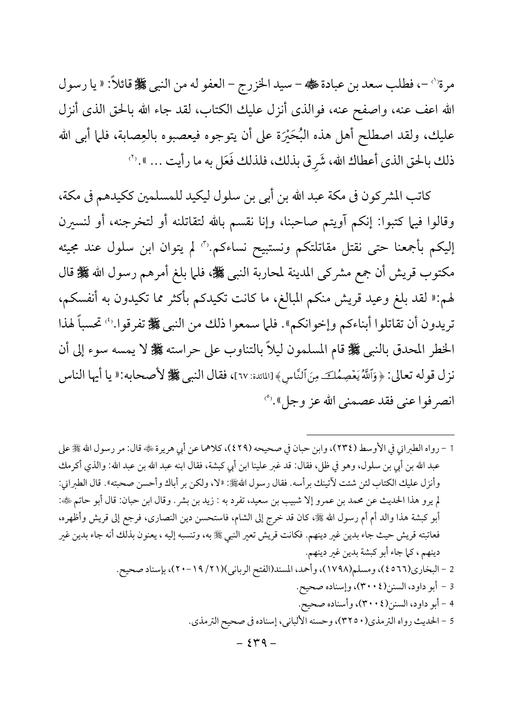 كاتب المشركون في مكة عبد الله بن أبى بن سلول ليكيد للمسلمين ككيدهم في مكة، وقالوا فيما كتبوا: إنكم آويتم صاحبنا، وإنا نقسم بالله لتقاتلنه أو لتخرجنه، أو لنسيرن إليكم بأجمعنا حتى نقتل مقاتلتكم ونستبيح نساءكم. (¬3) لم يتوان ابن سلول عند مجيئه مكتوب قريش أن جمع مشركى المدينة لمحاربة النبي - صَلَّى اللَّهُ عَلَيْهِ وَسَلَّمَ -، فلما بلغ أمرهم رسول الله - صَلَّى اللَّهُ عَلَيْهِ وَسَلَّمَ - قال لهم: «لقد بلغ وعيد قريش منكم المبالغ، ما كانت تكيدكم بأكثر مما تكيدون به أنفسكم، تريدون أن تقاتلوا أبناءكم وإخوانكم». فلما سمعوا ذلك من النبي - صَلَّى اللَّهُ عَلَيْهِ وَسَلَّمَ - تفرقوا. (¬4) تحسباً لهذا الخطر المحدق بالنبي - صَلَّى اللَّهُ عَلَيْهِ وَسَلَّمَ - قام المسلمون ليلاً بالتناوب على حراسته - صَلَّى اللَّهُ عَلَيْهِ وَسَلَّمَ - لا يمسه سوء إلى أن نزل قوله تعالى: {وَاللَّهُ يَعْصِمُكَ مِنَ النَّاسِ} [المائدة: 67]، فقال النبي - صَلَّى اللَّهُ عَلَيْهِ وَسَلَّمَ - لأصحابه: «يا أيها الناس انصرفوا عنى فقد عصمنى الله عز وجل». (¬5)