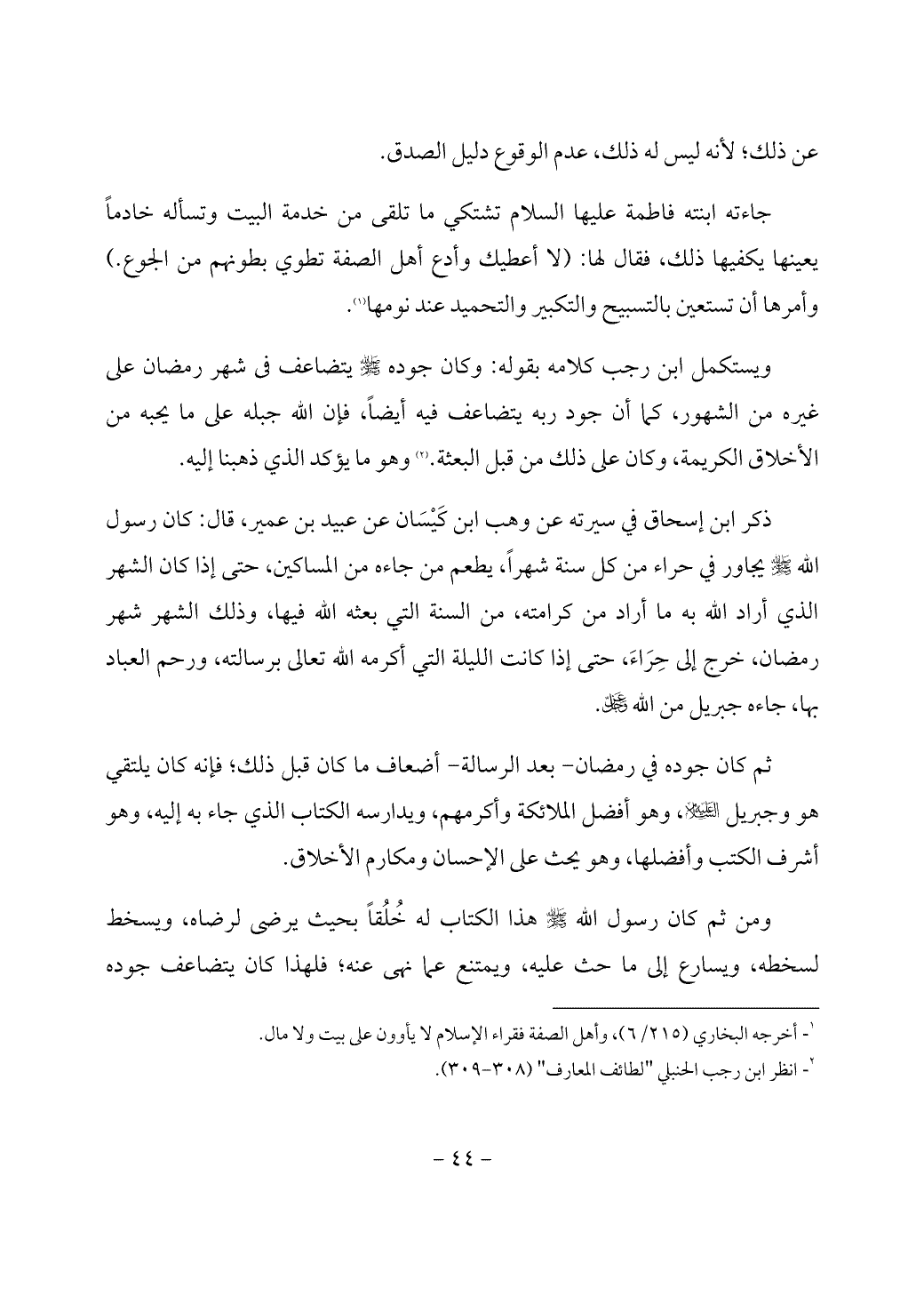 ويستكمل ابن رجب كلامه بقوله: وكان جوده - صَلَّى اللَّهُ عَلَيْهِ وَسَلَّمَ - يتضاعف في شهر رمضان على غيره من الشهور، كما أن جود ربه يتضاعف فيه أيضاً، فإن الله جبله على ما يحبه من الأخلاق الكريمة، وكان على ذلك من قبل البعثة. (¬2) وهو ما يؤكد الذي ذهبنا إليه.