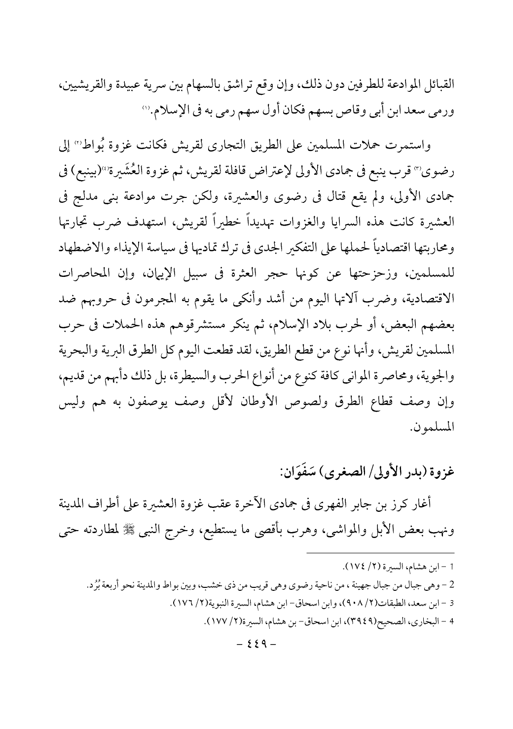 واستمرت حملات المسلمين على الطريق التجارى لقريش فكانت غزوة بُواط (¬2) إلى رضوى (¬3) قرب ينبع في جمادى الأولى لإعتراض قافلة لقريش، ثم غزوة العُشَيرة (¬4) (بينبع) في جمادى الأولى، ولم يقع قتال في رضوى والعشيرة، ولكن جرت موادعة بنى مدلج في العشيرة كانت هذه السرايا والغزوات تهديداً خطيراً لقريش، استهدف ضرب تجارتها ومحاربتها اقتصادياً لحملها على التفكير الجدى في ترك تماديها في سياسة الإيذاء والاضطهاد للمسلمين، وزحزحتها عن كونها حجر العثرة في سبيل الإيمان، وإن المحاصرات الاقتصادية، وضرب آلاتها اليوم من أشد وأنكى ما يقوم به المجرمون في حروبهم ضد بعضهم البعض، أو لحرب بلاد الإسلام، ثم ينكر مستشرقوهم هذه الحملات في حرب المسلمين لقريش، وأنها نوع من قطع الطريق، لقد قطعت اليوم كل الطرق البرية والبحرية والجوية، ومحاصرة الموانى كافة كنوع من أنواع الحرب والسيطرة، بل ذلك دأبهم من قديم، وإن وصف قطاع الطرق ولصوص الأوطان لأقل وصف يوصفون به هم وليس المسلمون.