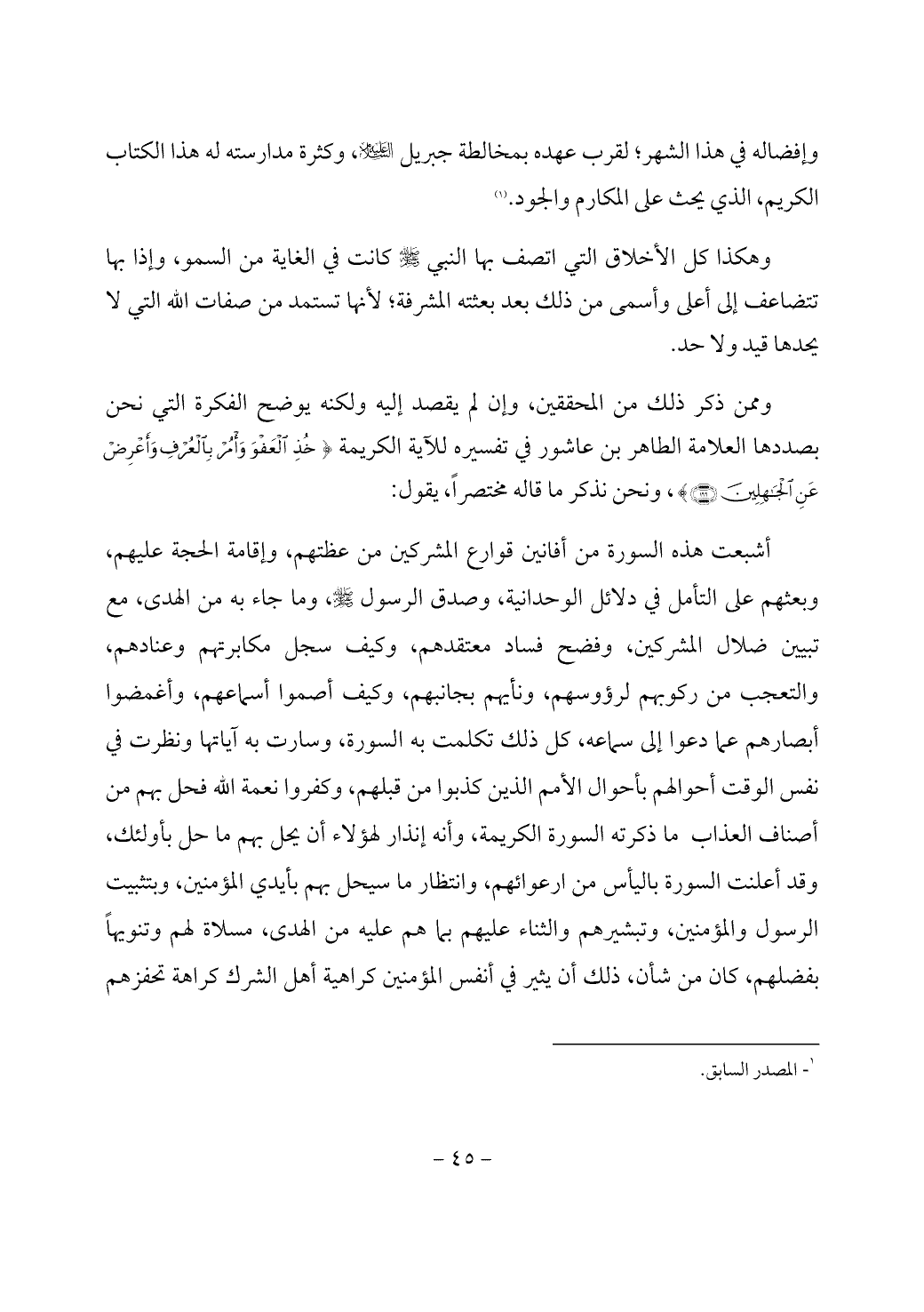 وممن ذكر ذلك من المحققين، وإن لم يقصد إليه ولكنه يوضح الفكرة التي نحن بصددها العلامة الطاهر بن عاشور في تفسيره للآية الكريمة {خُذِ الْعَفْوَ وَأْمُرْ بِالْعُرْفِ وَأَعْرِضْ عَنِ الْجَاهِلِينَ (199)}، ونحن نذكر ما قاله مختصراً، يقول: