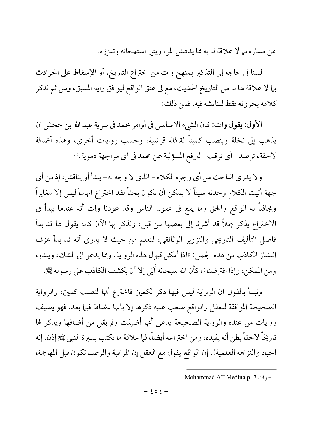 ولا يدرى الباحث من أي وجوه الكلام - الذى لا وجه له - يبدأ أو يناقش، إذ من أي جهة أتيت الكلام وجدته سيئاً لا يمكن أن يكون بحثاً لقد اختراع اتهاماً ليس إلا مغايراً ومجافياً به الواقع والحق وما يقع في عقول الناس وقد عودنا وات أنه عندما يبدأ في الاختراع يذكر جملاً قد أشرنا إلى بعضها من قبل، ونذكر بها الآن كأنه يقول ها قد بدأ فاصل التأليف التاريخى والتزوير الوثائقى، لنعلم من حيث لا يدرى أنه قد بدأ عزف النشاز الكاذب من هذه الجمل: «إذا أمكن قبول هذه الرواية، ومما يدعو إلى الشك، ويبدو، ومن الممكن، وإذا افترضنا»، كأن الله سبحانه أَبَى إلا أن يكشف الكاذب على رسوله - صَلَّى اللَّهُ عَلَيْهِ وَسَلَّمَ -.