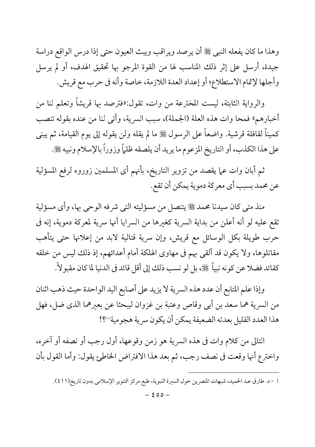 منذ متى كان سيدنا محمد - صَلَّى اللَّهُ عَلَيْهِ وَسَلَّمَ - يتنصل من مسؤليته التى شرفه الوحى بها، وأى مسؤلية تقع عليه لو أنه أعلن من بداية السرية كغيرها من السرايا أنها سرية لمعركة دموية، إنه في حرب طويلة بكل الوسائل مع قريش، وإن سرية قتالية لابد من إعلانها حتى يتأهب مقاتلوها، ولا يكون قد ألقى بهم في مهاوى الهلكة أمام أعدائهم، إذ ذلك ليس من خلقه كقائد فضلا عن كونه نبياً - صَلَّى اللَّهُ عَلَيْهِ وَسَلَّمَ -، بل لو نسب ذلك إلى أقل قائد في الدنيا لما كان مقبولاً.