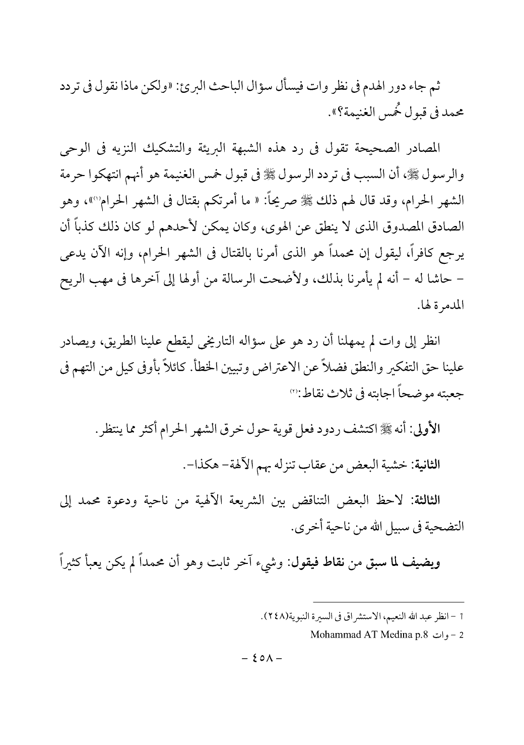 انظر إلى وات لم يمهلنا أن رد هو على سؤاله التاريخى ليقطع علينا الطريق، ويصادر علينا حق التفكير والنطق فضلاً عن الاعتراض وتبيين الخطأ. كائلاً بأوفى كيل من التهم في جعبته موضحاً اجابته في ثلاث نقاط: (¬2)