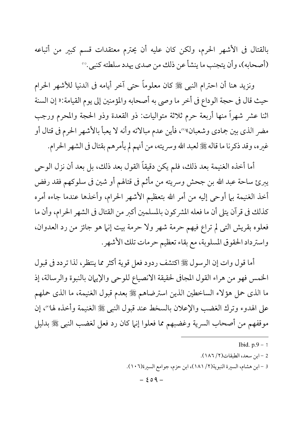 ونزيد هنا أن احترام النبي - صَلَّى اللَّهُ عَلَيْهِ وَسَلَّمَ - كان معلوماً حتى آخر أيامه في الدنيا للأشهر الحرام حيث قال في حجة الوداع في أخر ما وصى به أصحابه والمؤمنين إلى يوم القيامة: «إن السنة اثنا عشر شهراً منها أربعة حرم ثلاثة متواليات: ذو القعدة وذو الحجة والمحرم ورجب مضر الذى بين جمادى وشعبان» (¬2)، فأين عدم مبالاته وأنه لا يعبأ بالأشهر الحرم في قتال أو غيره، وقد ذكرنا ما قاله - صَلَّى اللَّهُ عَلَيْهِ وَسَلَّمَ - لعبد الله وسريته، من أنهم لم يأمرهم بقتال في الشهر الحرام.