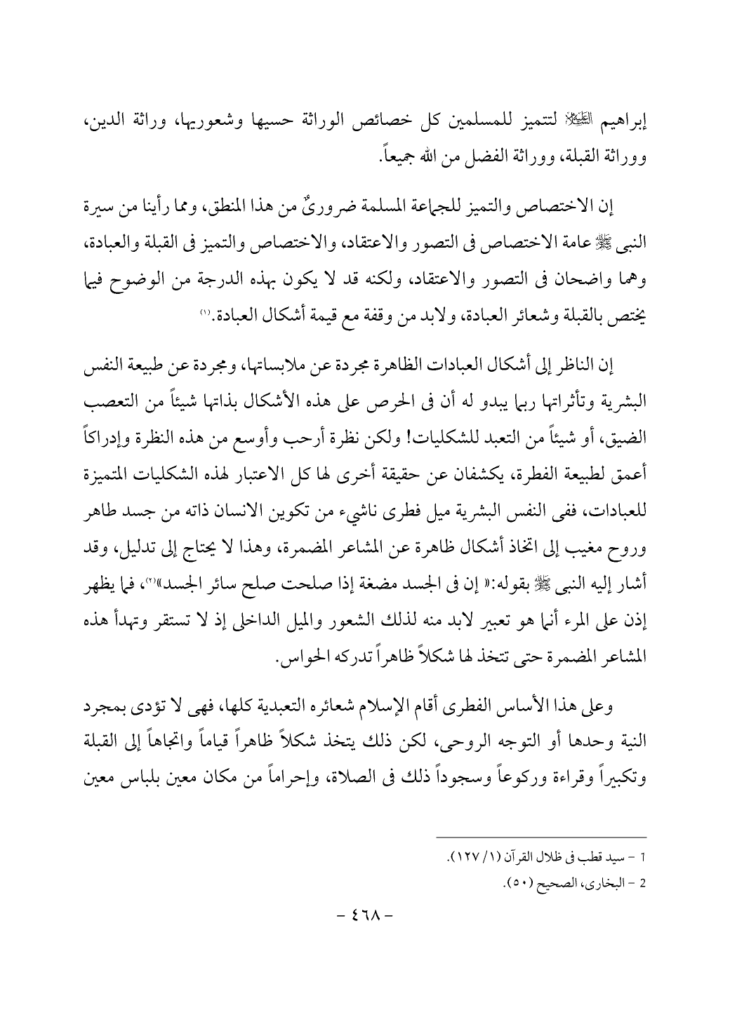 إن الاختصاص والتميز للجماعة المسلمة ضرورىٌ من هذا المنطق، ومما رأينا من سيرة النبي - صَلَّى اللَّهُ عَلَيْهِ وَسَلَّمَ - عامة الاختصاص في التصور والاعتقاد، والاختصاص والتميز في القبلة والعبادة، وهما واضحان في التصور والاعتقاد، ولكنه قد لا يكون بهذه الدرجة من الوضوح فيما يختص بالقبلة وشعائر العبادة، ولابد من وقفة مع قيمة أشكال العبادة. (¬1)