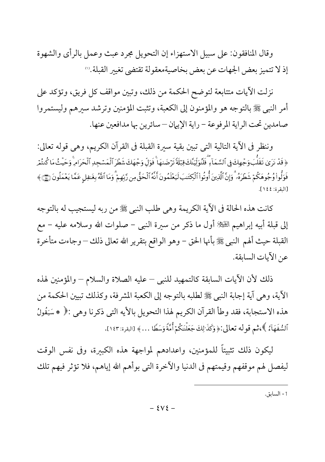 وقال المنافقون: على سبيل الاستهزاء إن التحويل مجرد عبث وعمل بالرأى والشهوة إذ لا تتميز بعض الجهات عن بعض بخاصيةمعقولة تقتضى تغيير القبلة. (¬1)