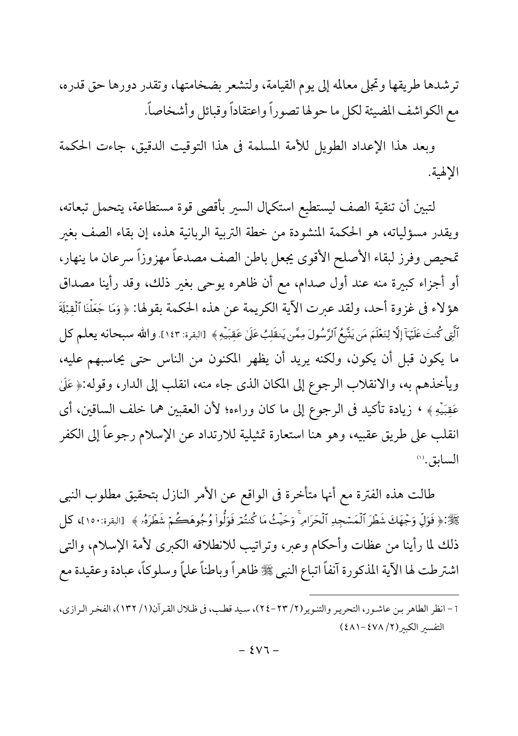 لتبين أن تنقية الصف ليستطيع استكمال السير بأقصى قوة مستطاعة، يتحمل تبعاته، ويقدر مسؤلياته، هو الحكمة المنشودة من خطة التربية الربانية هذه، إن بقاء الصف بغير تمحيص وفرز لبقاء الأصلح الأقوى يجعل باطن الصف مصدعاً مهزوزاً سرعان ما ينهار، أو أجزاء كبيرة منه عند أول صدام، مع أن ظاهره يوحى بغير ذلك، وقد رأينا مصداق هؤلاء في غزوة أحد، ولقد عبرت الآية الكريمة عن هذه الحكمة بقولها: {وَمَا جَعَلْنَا الْقِبْلَةَ الَّتِي كُنْتَ عَلَيْهَا إِلَّا لِنَعْلَمَ مَنْ يَتَّبِعُ الرَّسُولَ مِمَّنْ يَنْقَلِبُ عَلَى عَقِبَيْهِ} [البقرة: 143]. والله سبحانه يعلم كل ما يكون قبل أن يكون، ولكنه يريد أن يظهر المكنون من الناس حتى يحاسبهم عليه، ويأخذهم به، والانقلاب الرجوع إلى المكان الذى جاء منه، انقلب إلى الدار، وقوله: {عَلَى عَقِبَيْهِ}، زيادة تأكيد في الرجوع إلى ما كان وراءه؛ لأن العقبين هما خلف الساقين، أي انقلب على طريق عقبيه، وهو هنا استعارة تمثيلية للارتداد عن الإسلام رجوعاً إلى الكفر السابق. (¬1)