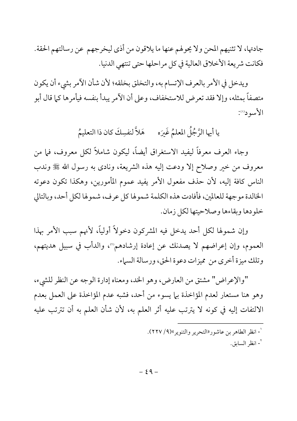 وجاء العرف معرفاً ليفيد الاستغراق أيضاً، ليكون شاملاً لكل معروف، فما من معروف من خير وصلاح إلا ودعت إليه هذه الشريعة، ونادى به رسول الله - صَلَّى اللَّهُ عَلَيْهِ وَسَلَّمَ - وندب الناس كافة إليه، لأن حذف مفعول الأمر يفيد عموم المأمورين، وهكذا تكون دعوته الخالدة موجهة للعالمين، فأفادت هذه الكلمة شمولها كل عرف، شمولها لكل أحد، وبالتالي خلودها وبقاءها وصلاحيتها لكل زمان.