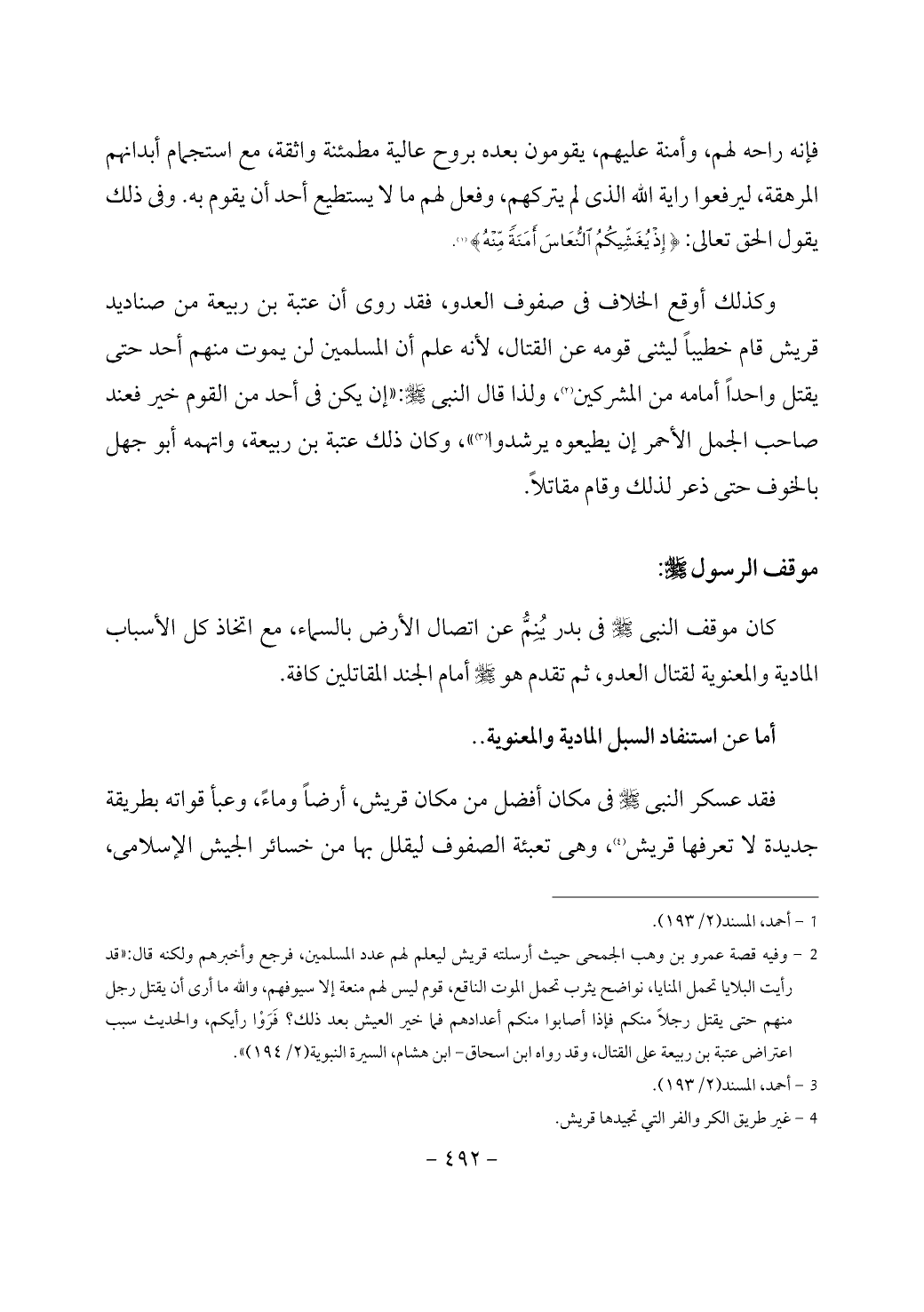 (¬2) وفيه قصة عمرو بن وهب الجمحى حيث أرسلته قريش ليعلم لهم عدد المسلمين، فرجع وأخبرهم ولكنه قال: «قد رأيت البلايا تحمل المنايا، نواضح يثرب تحمل الموت الناقع، قوم ليس لهم منعة إلا سيوفهم، والله ما أرى أن يقتل رجل منهم حتى يقتل رجلاً منكم فإذا أصابوا منكم أعدادهم فما خير العيش بعد ذلك؟ فَرَوْا رأيكم، والحديث سبب اعتراض عتبة بن ربيعة على القتال، وقد رواه ابن اسحاق - ابن هشام، السيرة النبوية (2/ 194)».