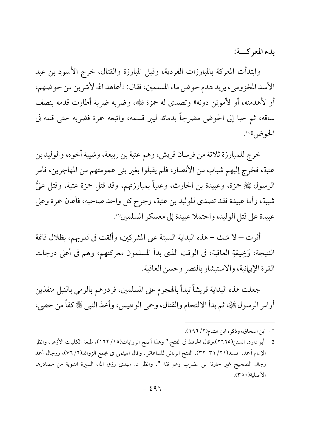 وابتدأت المعركة بالمبارزات الفردية، وقبل المبارزة والقتال، خرج الأسود بن عبد الأسد المخزومى، يريد هدم حوض ماء المسلمين، فقال: «أعاهد الله لأشربن من حوضهم، أو لأهدمنه، أو لأموتن دونه» وتصدى له حمزة - رضي الله عنه -، وضربه ضربة أطارت قدمه بنصف ساقه، ثم حبا إلى الحوض مضرجاً بدمائه ليبر قسمه، واتبعه حمزة فضربه حتى قتله في الحوض» (¬1).