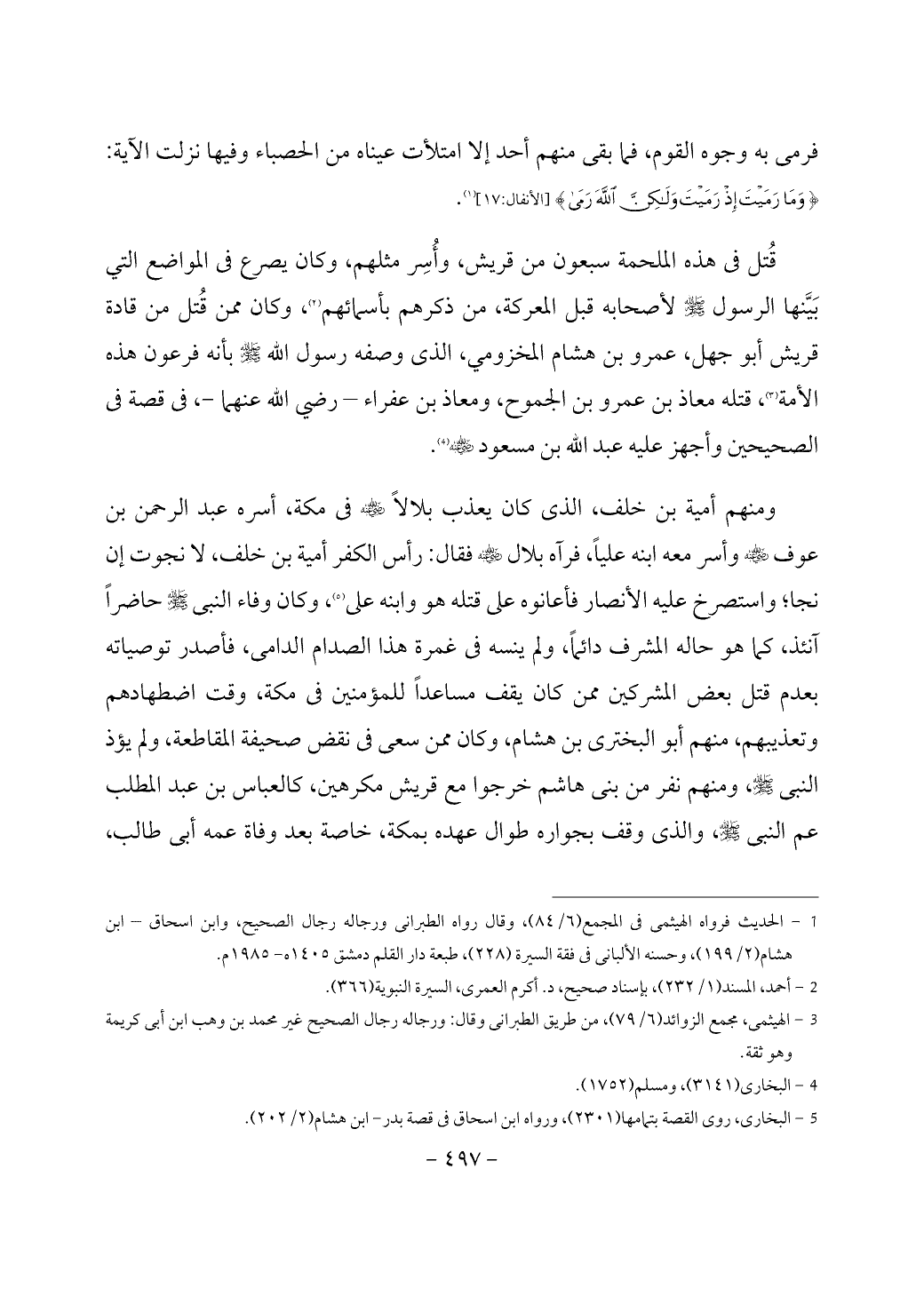 (¬1) الحديث فرواه الهيثمى في المجمع (6/ 84)، وقال رواه الطبرانى ورجاله رجال الصحيح، وابن اسحاق - ابن هشام (2/ 199)، وحسنه الألبانى في فقة السيرة (228)، طبعة دار القلم دمشق 1405 هـ - 1985 م.