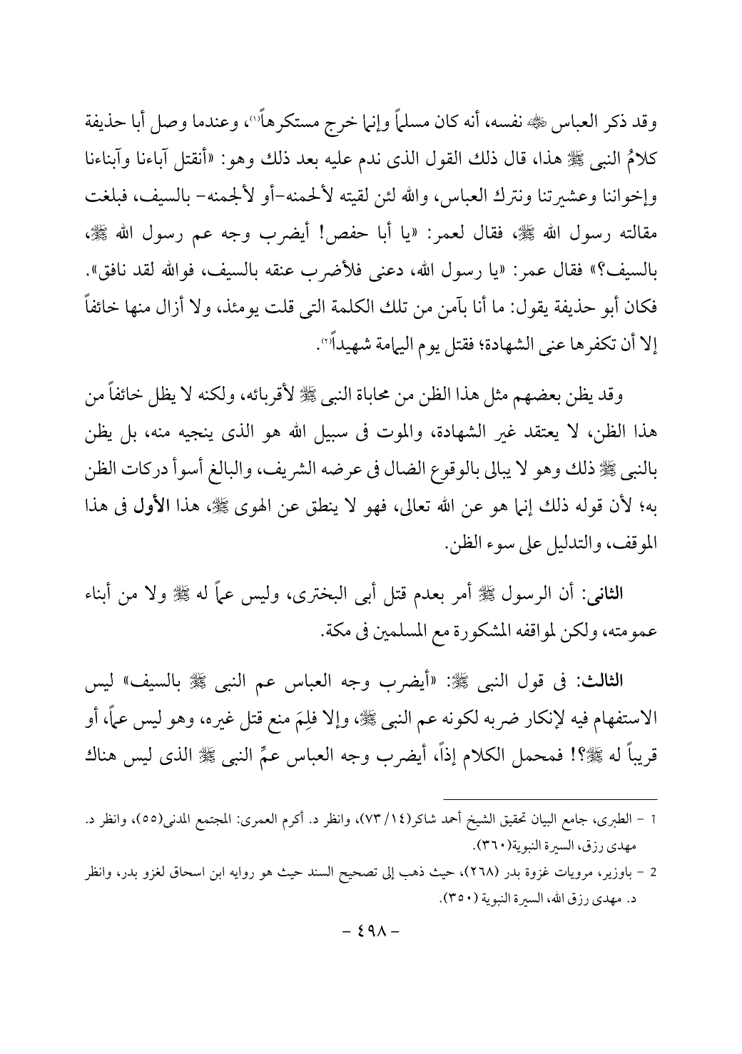 الثالث: في قول النبي - صَلَّى اللَّهُ عَلَيْهِ وَسَلَّمَ -: «أيضرب وجه العباس عم النبي - صَلَّى اللَّهُ عَلَيْهِ وَسَلَّمَ - بالسيف» ليس الاستفهام فيه لإنكار ضربه لكونه عم النبي - صَلَّى اللَّهُ عَلَيْهِ وَسَلَّمَ -، وإلا فلِمَ منع قتل غيره، وهو ليس عماً، أو قريباً له - صَلَّى اللَّهُ عَلَيْهِ وَسَلَّمَ -؟! فمحمل الكلام إذاً، أيضرب وجه العباس عمِّ النبي - صَلَّى اللَّهُ عَلَيْهِ وَسَلَّمَ - الذى ليس هناك