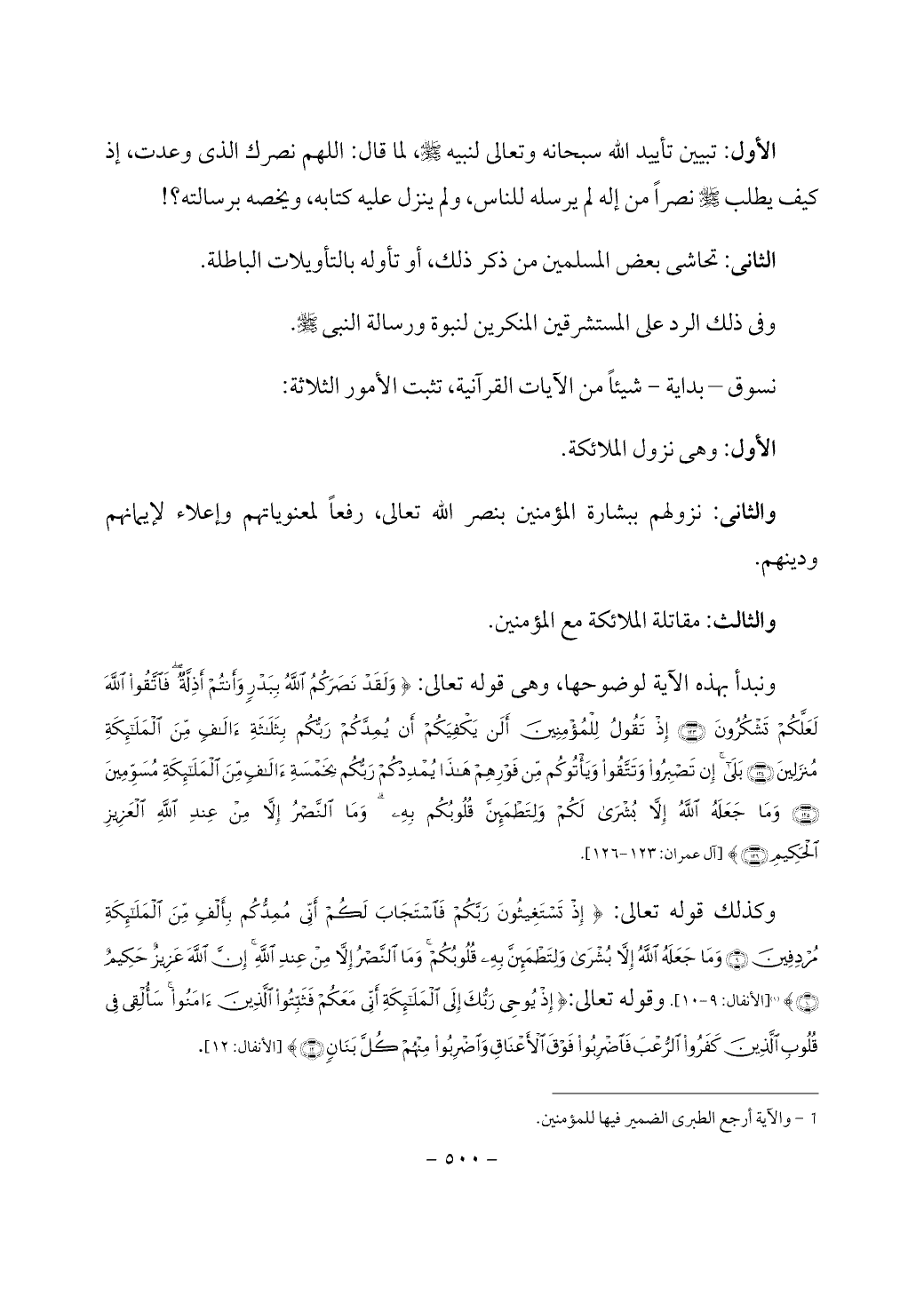 ونبدأ بهذه الآية لوضوحها، وهي قوله تعالى: {وَلَقَدْ نَصَرَكُمُ اللَّهُ بِبَدْرٍ وَأَنْتُمْ أَذِلَّةٌ فَاتَّقُوا اللَّهَ لَعَلَّكُمْ تَشْكُرُونَ (123) إِذْ تَقُولُ لِلْمُؤْمِنِينَ أَلَنْ يَكْفِيَكُمْ أَنْ يُمِدَّكُمْ رَبُّكُمْ بِثَلَاثَةِ آَلَافٍ مِنَ الْمَلَائِكَةِ