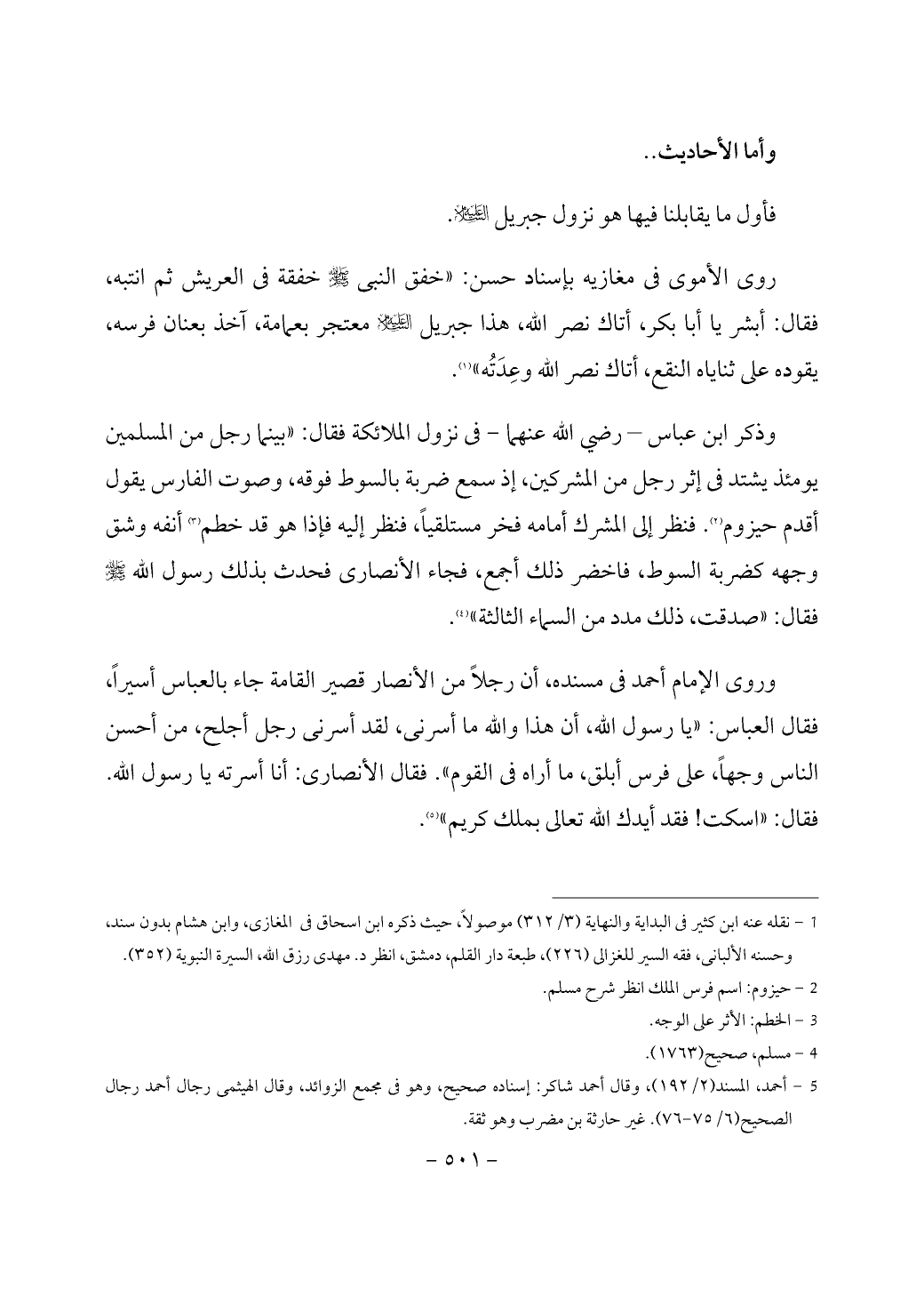 وذكر ابن عباس – رضي الله عنهما - في نزول الملائكة فقال: «بينما رجل من المسلمين يومئذ يشتد في إثر رجل من المشركين، إذ سمع ضربة بالسوط فوقه، وصوت الفارس يقول أقدم حيزوم (¬2). فنظر إلى المشرك أمامه فخر مستلقياً، فنظر إليه فإذا هو قد خطم (¬3) أنفه وشق وجهه كضربة السوط، فاخضر ذلك أجمع، فجاء الأنصارى فحدث بذلك رسول الله - صَلَّى اللَّهُ عَلَيْهِ وَسَلَّمَ - فقال: «صدقت، ذلك مدد من السماء الثالثة» (¬4).