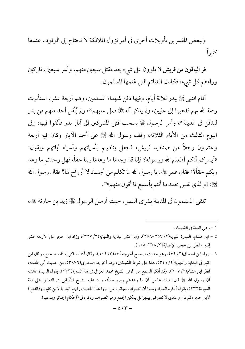 (¬3) رواه ابن اسحاق (2/ 74)، وهو حديث صحيح أخرجه أحمد (3/ 104)، وقال أحمد شاكر إسناده صحيح، وقال ابن كثير في البداية والنهاية (2/ 341)، هذا على شرط الشيخين، وقد أخرجه البخاري (3976)، من حديث أبى طلحة، انظر ابن هشام (2/ 207)، وقد أنكر السمع من الموتى الشيخ محمد الغزالى في فقة السيرة (233)، بقول السيدة عائشة أن رسول الله - صَلَّى اللَّهُ عَلَيْهِ وَسَلَّمَ - قال: «لقد علموا أن ما وعدهم ربهم حقاً»، ورد عليه الشيخ الألبانى في التعليق على فقة السيرة (232)، بقوله أنكره العلماء وبينوا أن الصواب بجانب من رووا هذا الحديث راجع البداية لابن كثير، و (الفتح) لابن حجر، ثم قال وعندى لا تعارض بينهما بل يمكن الجمع وهو الصواب وذكره في (أحكام الجنائز وبدعها).