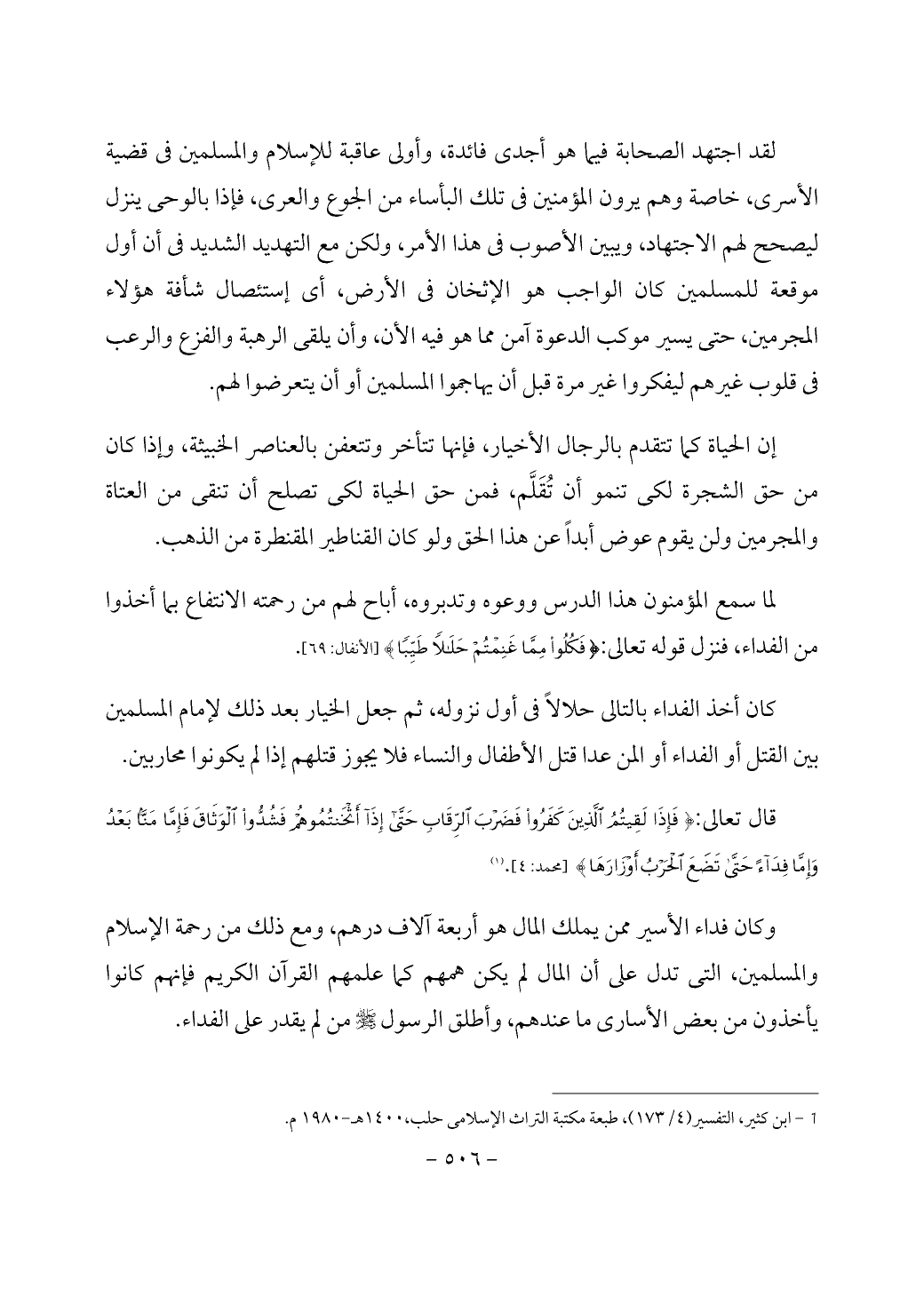 لقد اجتهد الصحابة فيما هو أجدى فائدة، وأولى عاقبة للإسلام والمسلمين في قضية الأسرى، خاصة وهم يرون المؤمنين في تلك البأساء من الجوع والعرى، فإذا بالوحى ينزل ليصحح لهم الاجتهاد، ويبين الأصوب في هذا الأمر، ولكن مع التهديد الشديد في أن أول موقعة للمسلمين كان الواجب هو الإثخان في الأرض، أي إستئصال شأفة هؤلاء المجرمين، حتى يسير موكب الدعوة آمن مما هو فيه الأن، وأن يلقى الرهبة والفزع والرعب في قلوب غيرهم ليفكروا غير مرة قبل أن يهاجموا المسلمين أو أن يتعرضوا لهم.