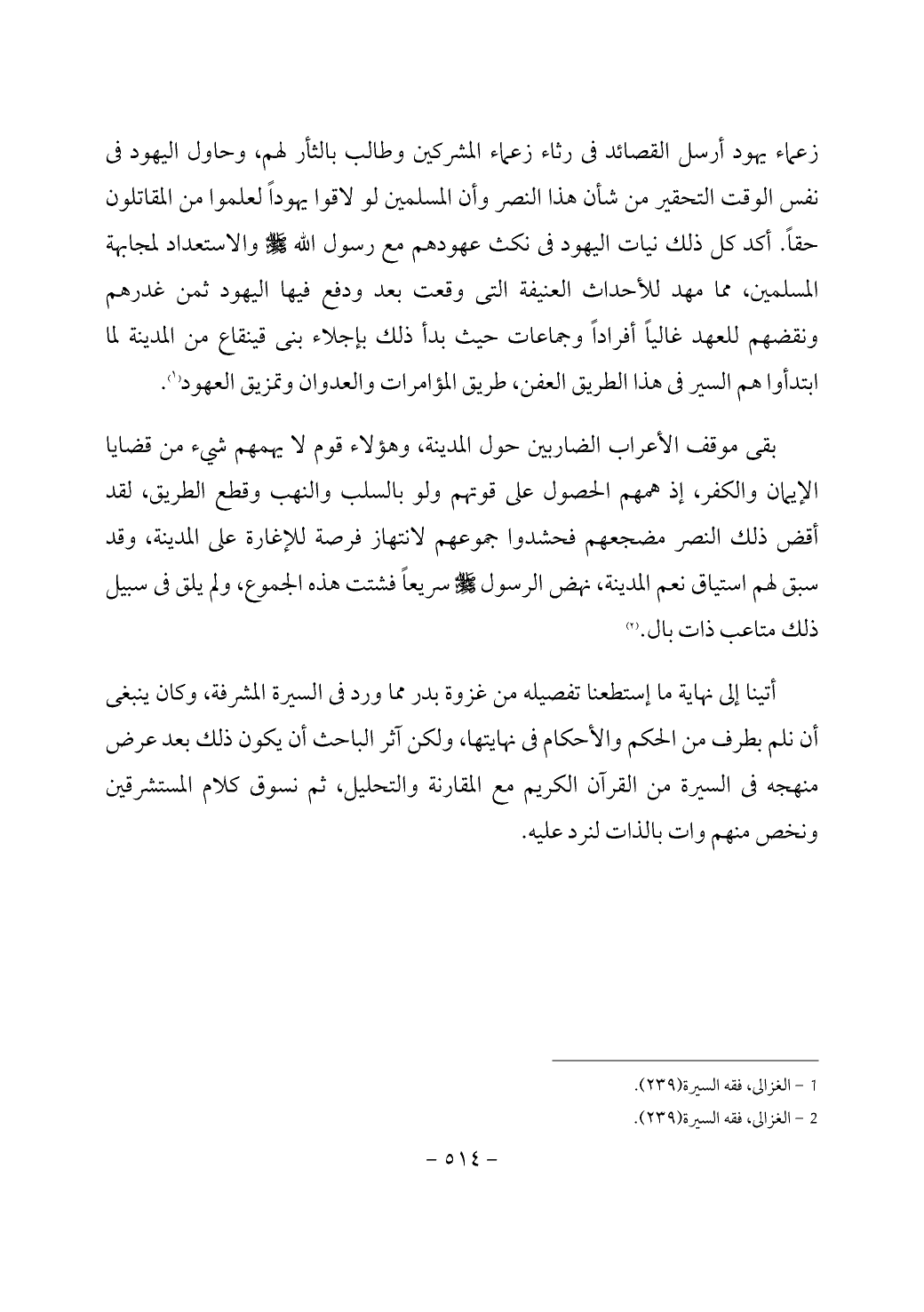 أتينا إلى نهاية ما إستطعنا تفصيله من غزوة بدر مما ورد في السيرة المشرفة، وكان ينبغى أن نلم بطرف من الحكم والأحكام في نهايتها، ولكن آثر الباحث أن يكون ذلك بعد عرض منهجه في السيرة من القرآن الكريم مع المقارنة والتحليل، ثم نسوق كلام المستشرقين ونخص منهم وات بالذات لنرد عليه.