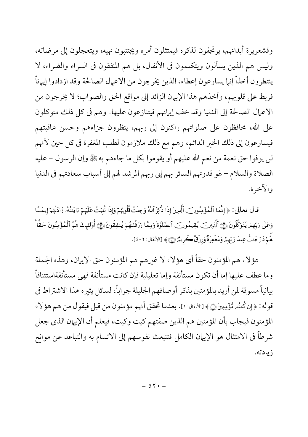 قال تعالى: {إِنَّمَا الْمُؤْمِنُونَ الَّذِينَ إِذَا ذُكِرَ اللَّهُ وَجِلَتْ قُلُوبُهُمْ وَإِذَا تُلِيَتْ عَلَيْهِمْ آَيَاتُهُ زَادَتْهُمْ إِيمَانًا وَعَلَى رَبِّهِمْ يَتَوَكَّلُونَ (2) الَّذِينَ يُقِيمُونَ الصَّلَاةَ وَمِمَّا رَزَقْنَاهُمْ يُنْفِقُونَ (3) أُولَئِكَ هُمُ الْمُؤْمِنُونَ حَقًّا لَهُمْ دَرَجَاتٌ عِنْدَ رَبِّهِمْ وَمَغْفِرَةٌ وَرِزْقٌ كَرِيمٌ (4)} [الأنفال: 2 - 4].