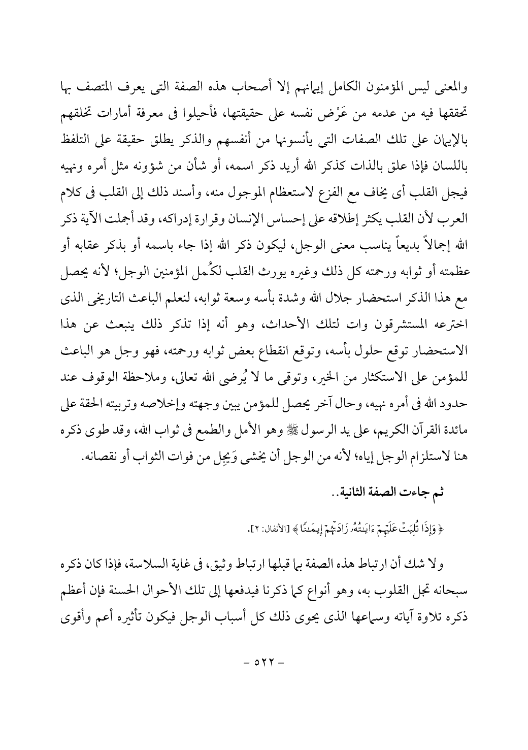 والمعنى ليس المؤمنون الكامل إيمانهم إلا أصحاب هذه الصفة التى يعرف المتصف بها تحققها فيه من عدمه من عَرْض نفسه على حقيقتها، فأحيلوا في معرفة أمارات تخلقهم بالإيمان على تلك الصفات التى يأنسونها من أنفسهم والذكر يطلق حقيقة على التلفظ باللسان فإذا علق بالذات كذكر الله أريد ذكر اسمه، أو شأن من شؤونه مثل أمره ونهيه فيجل القلب أي يخاف مع الفزع لاستعظام الموجول منه، وأسند ذلك إلى القلب في كلام العرب لأن القلب يكثر إطلاقه على إحساس الإنسان وقرارة إدراكه، وقد أجملت الآية ذكر الله إجمالاً بديعاً يناسب معنى الوجل، ليكون ذكر الله إذا جاء باسمه أو بذكر عقابه أو عظمته أو ثوابه ورحمته كل ذلك وغيره يورث القلب لكُمل المؤمنين الوجل؛ لأنه يحصل مع هذا الذكر استحضار جلال الله وشدة بأسه وسعة ثوابه، لنعلم الباعث التاريخى الذى اخترعه المستشرقون وات لتلك الأحداث، وهو أنه إذا تذكر ذلك ينبعث عن هذا الاستحضار توقع حلول بأسه، وتوقع انقطاع بعض ثوابه ورحمته، فهو وجل هو الباعث للمؤمن على الاستكثار من الخير، وتوقى ما لا يُرضى الله تعالى، وملاحظة الوقوف عند حدود الله في أمره نهيه، وحال آخر يحصل للمؤمن يبين وجهته وإخلاصه وتربيته الحقة على مائدة القرآن الكريم، على يد الرسول - صَلَّى اللَّهُ عَلَيْهِ وَسَلَّمَ - وهو الأمل والطمع في ثواب الله، وقد طوى ذكره هنا لاستلزام الوجل إياه؛ لأنه من الوجل أن يخشى وَيجِل من فوات الثواب أو نقصانه.