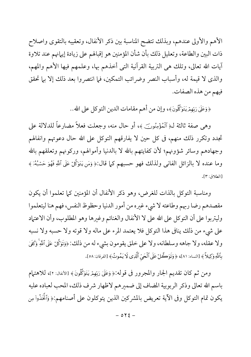 ومن ثم كان تقديم الجار والمجرور في قوله: {وَعَلَى رَبِّهِمْ يَتَوَكَّلُونَ} [الأنفال: 2]، للاهتمام باسم الله تعالى وذكر الربوبية المضاف إلى ضميرهم لاظهار شرف ذلك، المحب لعباده عليه يكون تمام التوكل وفي الآية تعريض بالمشركين الذين يتوكلون على أصنامهم: {وَاتَّخَذُوا مِنْ