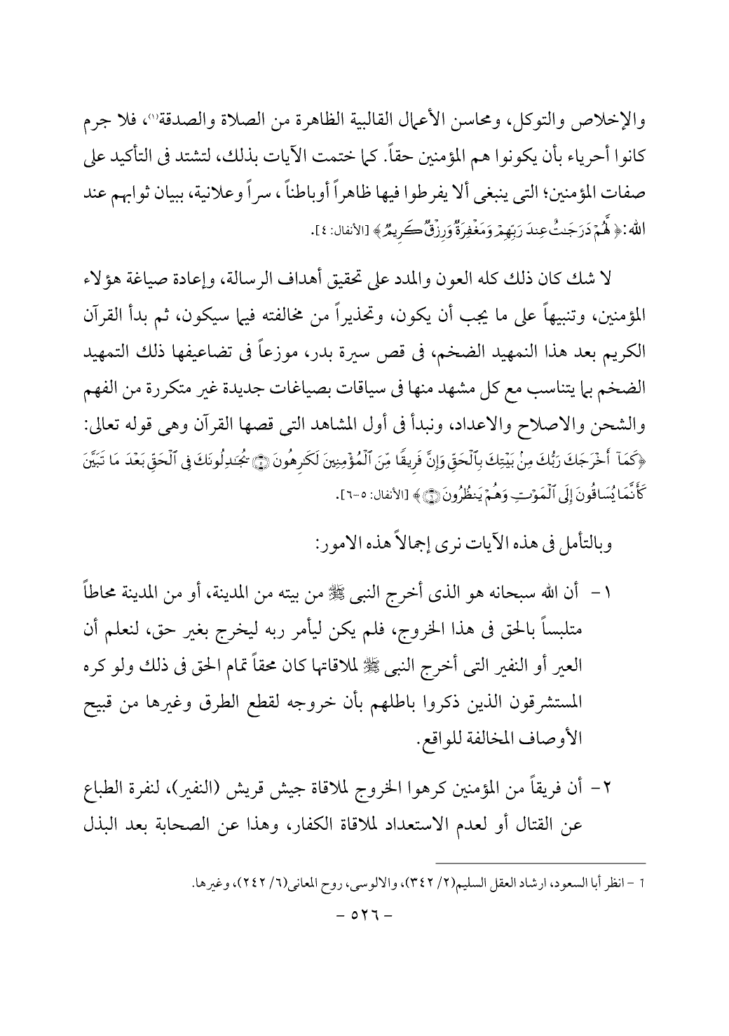 لا شك كان ذلك كله العون والمدد على تحقيق أهداف الرسالة، وإعادة صياغة هؤلاء المؤمنين، وتنبيهاً على ما يجب أن يكون، وتحذيراً من مخالفته فيما سيكون، ثم بدأ القرآن الكريم بعد هذا النمهيد الضخم، في قص سيرة بدر، موزعاً في تضاعيفها ذلك التمهيد الضخم بما يتناسب مع كل مشهد منها في سياقات بصياغات جديدة غير متكررة من الفهم والشحن والاصلاح والاعداد، ونبدأ في أول المشاهد التى قصها القرآن وهي قوله تعالى: {كَمَا أَخْرَجَكَ رَبُّكَ مِنْ بَيْتِكَ بِالْحَقِّ وَإِنَّ فَرِيقًا مِنَ الْمُؤْمِنِينَ لَكَارِهُونَ (5) يُجَادِلُونَكَ فِي الْحَقِّ بَعْدَ مَا تَبَيَّنَ كَأَنَّمَا يُسَاقُونَ إِلَى الْمَوْتِ وَهُمْ يَنْظُرُونَ} [الأنفال: 5 - 6].