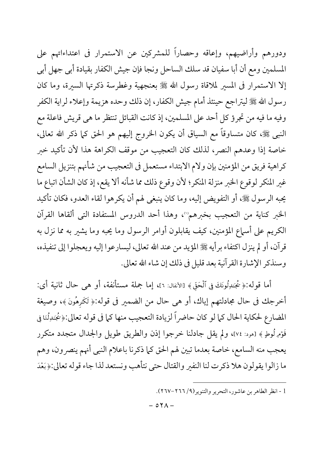 ودورهم وأراضيهم، وإعاقه وحصاراً للمشركين عن الاستمرار في اعتداءاتهم على المسلمين ومع أن أبا سفيان قد سلك الساحل ونجا فإن جيش الكفار بقيادة أبى جهل أبى إلا الاستمرار في المسير لملاقاة رسول الله - صَلَّى اللَّهُ عَلَيْهِ وَسَلَّمَ - بعنجهية وغطرسة ذكرتها السيرة، وما كان رسول الله - صَلَّى اللَّهُ عَلَيْهِ وَسَلَّمَ - ليتراجع حينئذ أمام جيش الكفار، إن ذلك وحده هزيمة وإعلاء لراية الكفر وفيه ما فيه من تجرؤ كل أحد على المسلمين، إذ كانت القبائل تنتظر ما هي قريش فاعلة مع النبي - صَلَّى اللَّهُ عَلَيْهِ وَسَلَّمَ -، كان متساوقاً مع السياق أن يكون الخروج إليهم هو الحق كما ذكر الله تعالى، خاصة إذا وعدهم النصر، لذلك كان التعجيب من موقف الكراهة هذا لأن تأكيد خبر كراهية فريق من المؤمنين بإن ولام الابتداء مستعمل في التعجيب من شأنهم بتنزيل السامع غير المنكر لوقوع الخبر منزلة المنكر؛ لأن وقوع ذلك مما شأنه ألا يقع، إذ كان الشأن اتباع ما يحبه الرسول - صَلَّى اللَّهُ عَلَيْهِ وَسَلَّمَ -، أو التفويض إليه، وما كان ينبغى لهم أن يكرهوا لقاء العدو، فكان تأكيد الخبر كناية من التعجيب بخبرهم (¬1)، وهذا أحد الدروس المستفادة التى ألقاها القرآن الكريم على أسماع المؤمنين، كيف يقابلون أوامر الرسول وما يحبه وما يشير به مما نزل به قرآن، أو لم ينزل اكتفاء برأيه - صَلَّى اللَّهُ عَلَيْهِ وَسَلَّمَ - المؤيد من عند الله تعالى، ليسارعوا إليه ويعجلوا إلى تنفيذه، وسنذكر الإشارة القرآنية بعد قليل في ذلك إن شاء الله تعالى.