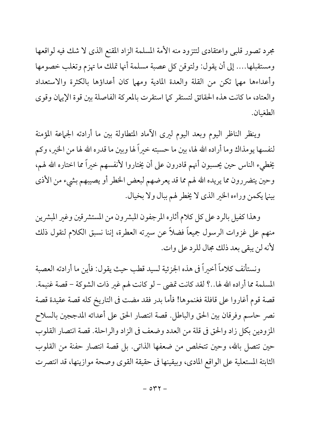 مجرد تصور قلبى واعتقادى لتتزود منه الأمة المسلمة الزاد المقنع الذى لا شك فيه لواقعها ومستقبلها .... إلى أن يقول: ولتوقن كل عصبة مسلمة أنها تملك ما تهزم وتغلب خصومها وأعداءها مهما تكن من القلة والعدة المادية ومهما كان أعداؤها بالكثرة والاستعداد والعتاد، ما كانت هذه الحقائق لتستقر كما استقرت بالمعركة الفاصلة بين قوة الإيمان وقوى الطغيان.