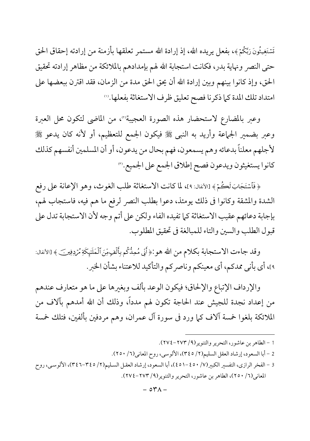 وعبر بالمضارع لاستحضار هذه الصورة العجيبة (¬2)، من الماضى لتكون محل العبرة وعبر بضمير الجماعة وأريد به النبي - صَلَّى اللَّهُ عَلَيْهِ وَسَلَّمَ - فيكون الجمع للتعظيم، أو لأنه كان يدعو - صَلَّى اللَّهُ عَلَيْهِ وَسَلَّمَ - لأجلهم معلناً بدعائه وهم يسمعون، فهم بحال من يدعون، أو أن المسلمين أنفسهم كذلك كانوا يستغيثون ويدعون فصح إطلاق الجمع على الجميع. (¬3)