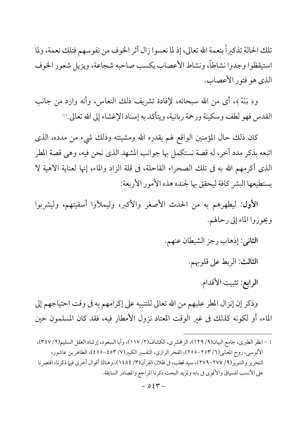 كان ذلك حال المؤمنين الواقع لهم بقدره الله ومشيئته وذلك شيء من مدده، الذى اتبعه بذكر مدد آخر، له قصة نستكمل بها جوانب المشهد الذى نحن فيه، وهي قصة المطر الذى أكرمهم الله به في تلك الصحراء القاحلة، في قلة الزاد والماء، إنها لعناية الاهية لا يستطيعها البشر كافة ليحقق بها لجنده هذه الأمور الأربعة: