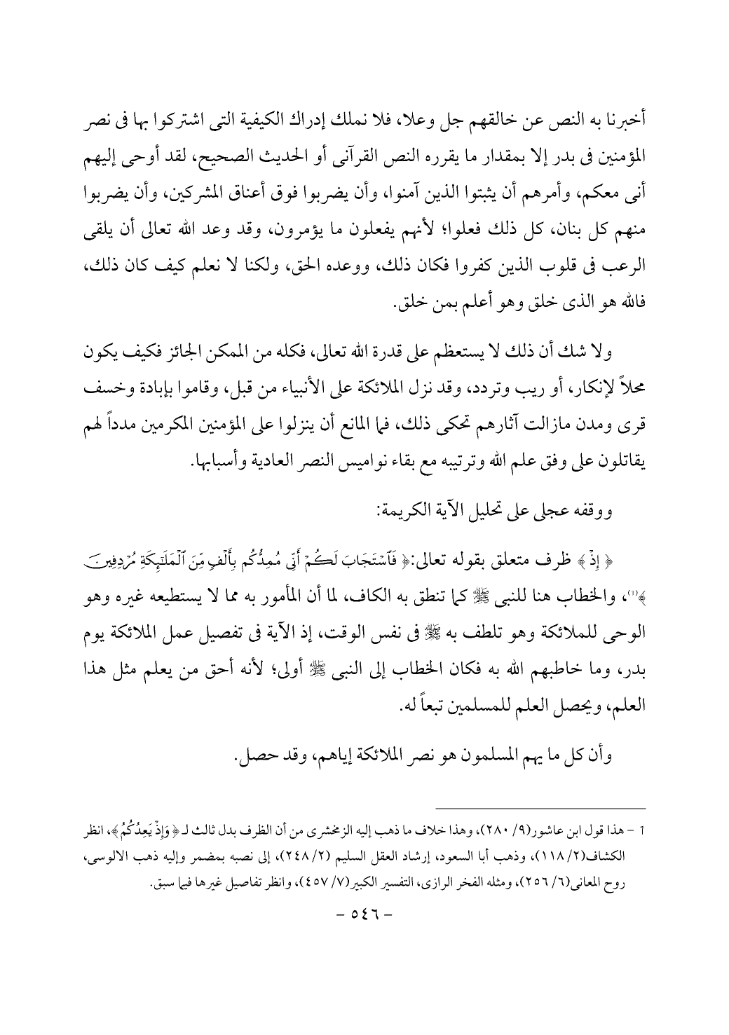 ولا شك أن ذلك لا يستعظم على قدرة الله تعالى، فكله من الممكن الجائز فكيف يكون محلاً لإنكار، أو ريب وتردد، وقد نزل الملائكة على الأنبياء من قبل، وقاموا بإبادة وخسف قرى ومدن مازالت آثارهم تحكى ذلك، فما المانع أن ينزلوا على المؤمنين المكرمين مدداً لهم يقاتلون على وفق علم الله وترتيبه مع بقاء نواميس النصر العادية وأسبابها.