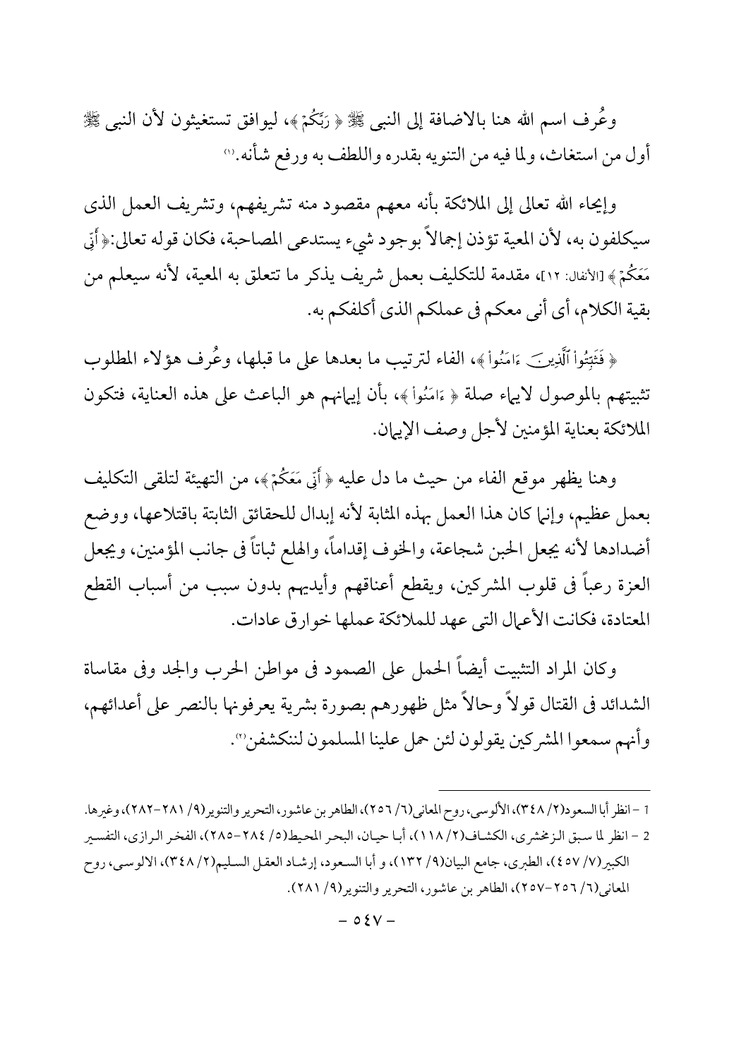 وإيحاء الله تعالى إلى الملائكة بأنه معهم مقصود منه تشريفهم، وتشريف العمل الذى سيكلفون به، لأن المعية تؤذن إجمالاً بوجود شيء يستدعى المصاحبة، فكان قوله تعالى: {أَنِّي مَعَكُمْ} [الأنفال: 12]، مقدمة للتكليف بعمل شريف يذكر ما تتعلق به المعية، لأنه سيعلم من بقية الكلام، أي أنى معكم في عملكم الذى أكلفكم به.
