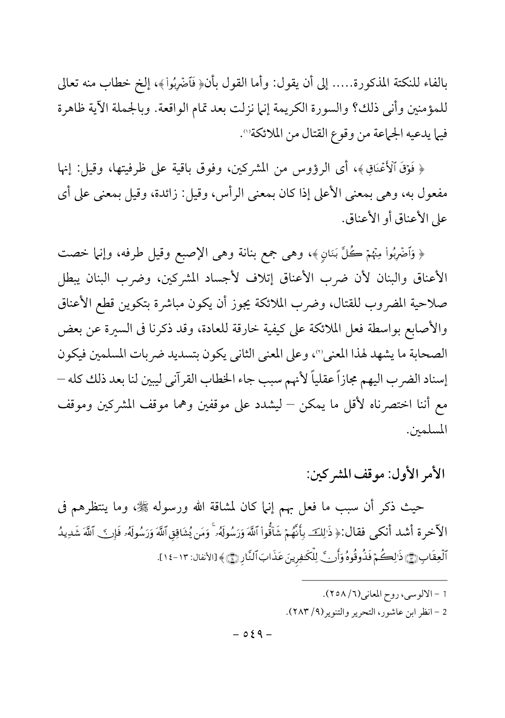 {وَاضْرِبُوا مِنْهُمْ كُلَّ بَنَانٍ}، وهي جمع بنانة وهي الإصبع وقيل طرفه، وإنما خصت الأعناق والبنان لأن ضرب الأعناق إتلاف لأجساد المشركين، وضرب البنان يبطل صلاحية المضروب للقتال، وضرب الملائكة يجوز أن يكون مباشرة بتكوين قطع الأعناق والأصابع بواسطة فعل الملائكة على كيفية خارقة للعادة، وقد ذكرنا في السيرة عن بعض الصحابة ما يشهد لهذا المعنى (¬2)، وعلى المعنى الثاني يكون بتسديد ضربات المسلمين فيكون إسناد الضرب اليهم مجازاً عقلياً لأنهم سبب جاء الخطاب القرآنى ليبين لنا بعد ذلك كله – مع أننا اختصرناه لأقل ما يمكن – ليشدد على موقفين وهما موقف المشركين وموقف المسلمين.